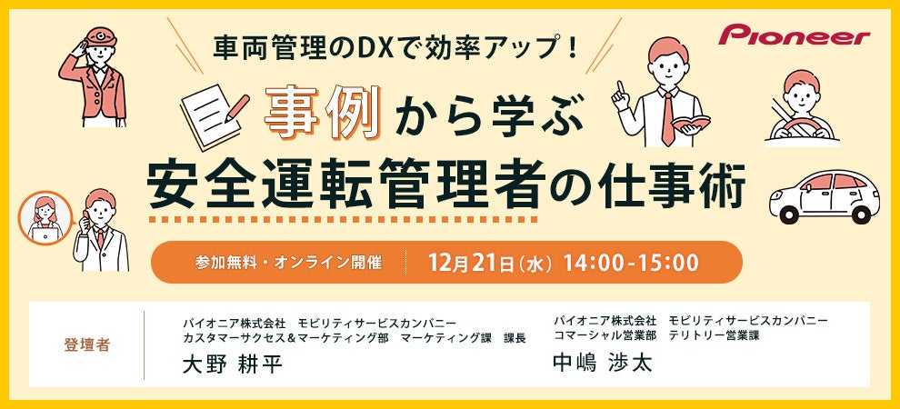 パイオニアは、車両管理者・安全運転管理者向けのウェビナー「車両管理のDXで効率アップ! 事例から学ぶ安全運転管理者の仕事術」を、12月21日(水)に開催します。