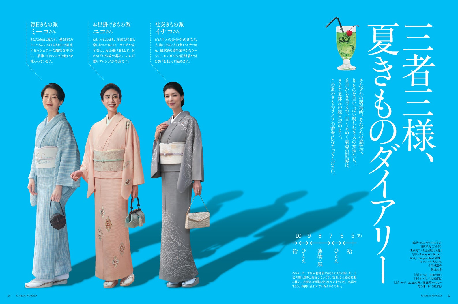 それぞれの感性で、 きものを目いっぱい楽しむ3人の女性たち。 6月から9月まで、目くるめく着姿の記録は、 まるで夏休みの絵日記のよう。 この夏のきものライフの参考になさってください。