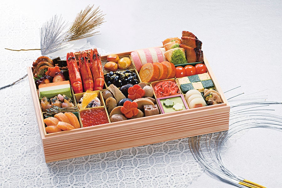 ・商品概要:32品目を盛り込んだ長手重。三種の国産野菜三種類で仕上げた色鮮やかなテリーヌや、近海で水揚げされた国産の足赤海老を艶煮に炊き上げた「つの字海老」、甘酢で漬け込んだ大根で時鮭を巻き上げ「初日の出」に見立てた「日の出砧巻」など、和洋折衷の彩り豊かなメニューが楽しめます。