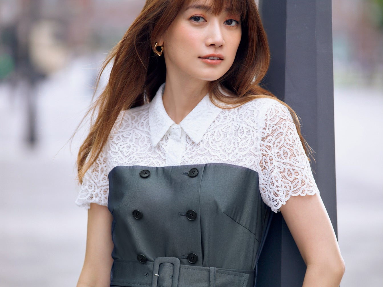 レースとシャンブレー素材をドッキングさせたコルセット風コンビネゾン。ダブルボタンやジャケットデティールがメンズライクな印象もありつつ、フィットしたラインとペプラムデザインで女性らしいシルエットも表現。フレアパンツが軽やかでデイリーにもオケージョンにも幅広く大活躍する1枚です。