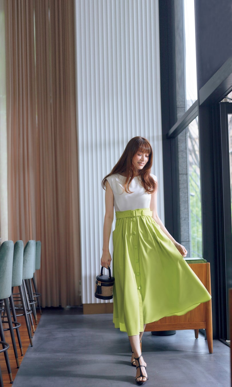 フロントでカットされたウエストデザインやフロントボタンがアクセントの1枚。