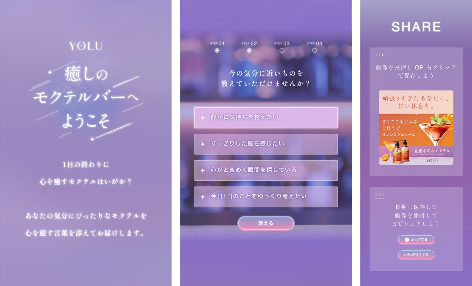 特設サイトだけの限定コンテンツ「癒しのモクテルバー」では、あなたの気分にぴったりなモクテルを診断することができます。ぜひキャンペーンや限定コンテンツをお楽しみください。