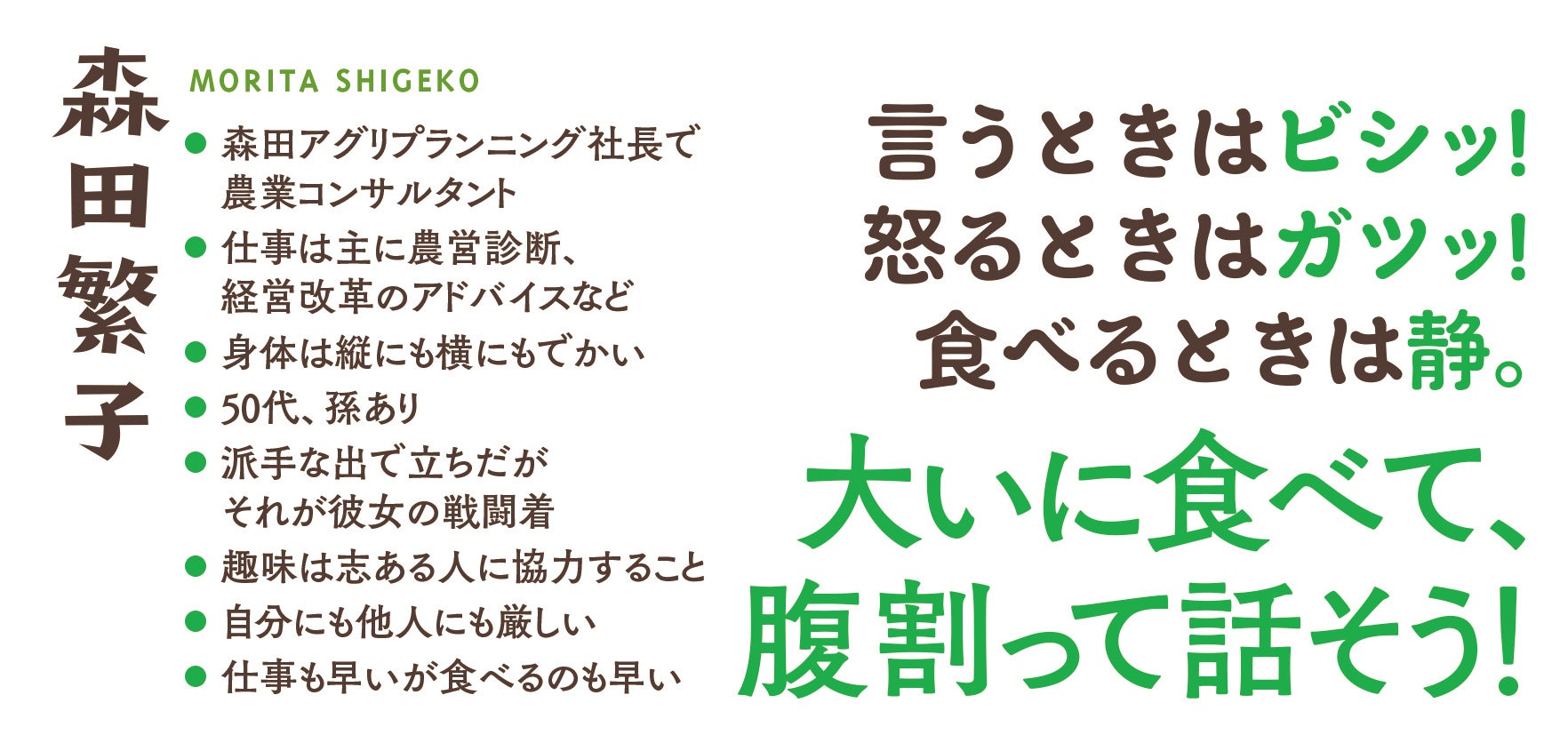 主人公の名は森田繁子。縦にも横にもデッカイ身体の、派手で異色な農業コンサルタントです。家族や地域など当事者たちだけではなかなか大きな声を上げられないお悩みにこそ、直接の損益がない森繁(略称)さんのような人にズバッと切り込んでもらって、関係するみんなが腹八分の満足を共有できたなら。そんな願いを込めた主人公です。森繁さんと学生アルバイト・山田くんの活躍にクスっと笑って頂けたら嬉しいです。