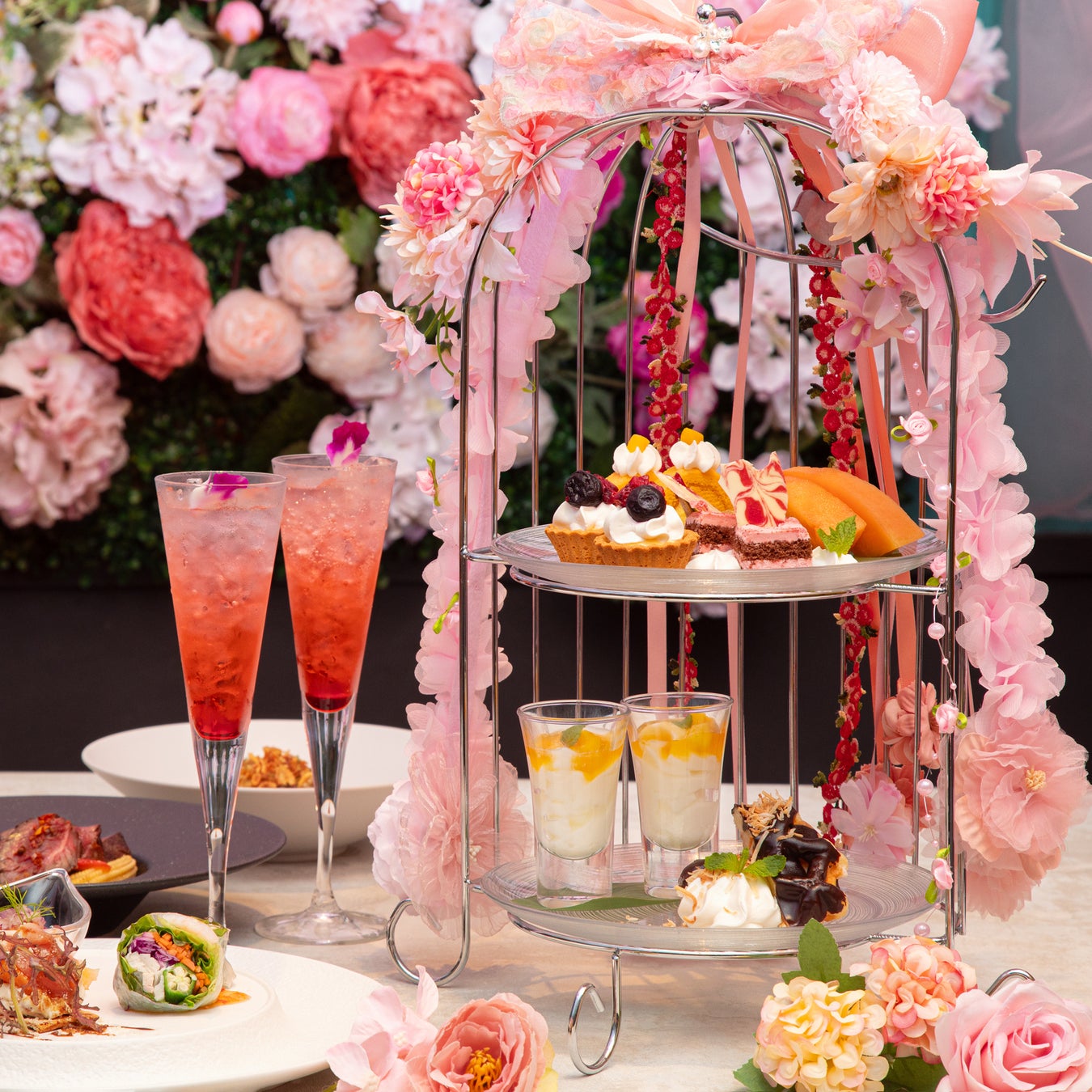 たくさんの花に覆われたスタンドには小ぶりで可愛らしいスイーツが並び、会話にも華を添えること間違いなし。