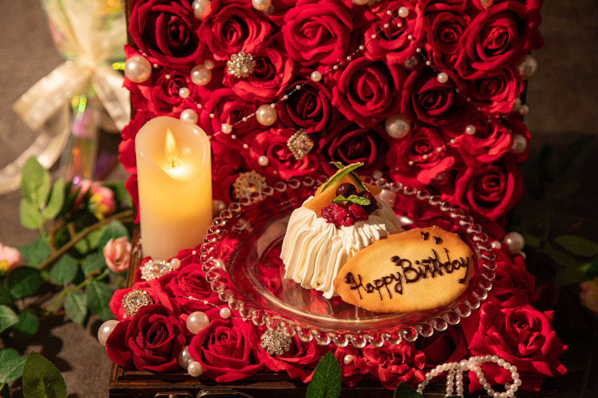 宝箱を開けると、白い煙とともに姿を現す真っ赤な薔薇の花畑。その真ん中に純白のケーキが鎮座している。これがお店から記念日を迎えるお客様への無料プレゼントだと言うから驚きだ。