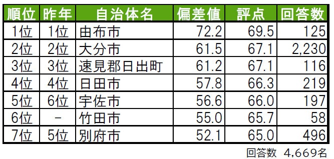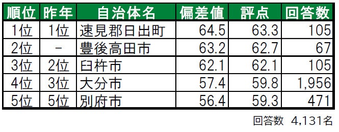 1位は唯一偏差値70台の由布市で、「住みここち」では4位となっています。2位は大分市で、「住みここち」1位、「住みたい街」2位となっています。3位は速見郡日出町で、「住み続けたい街」「街に愛着がある」1位、「住みここち」「街に誇りがある」2位と、各ランキングで高い評価を得ています。トップ4は昨年と全く同じ顔ぶれで、2年連続でランクインする結果となっています。