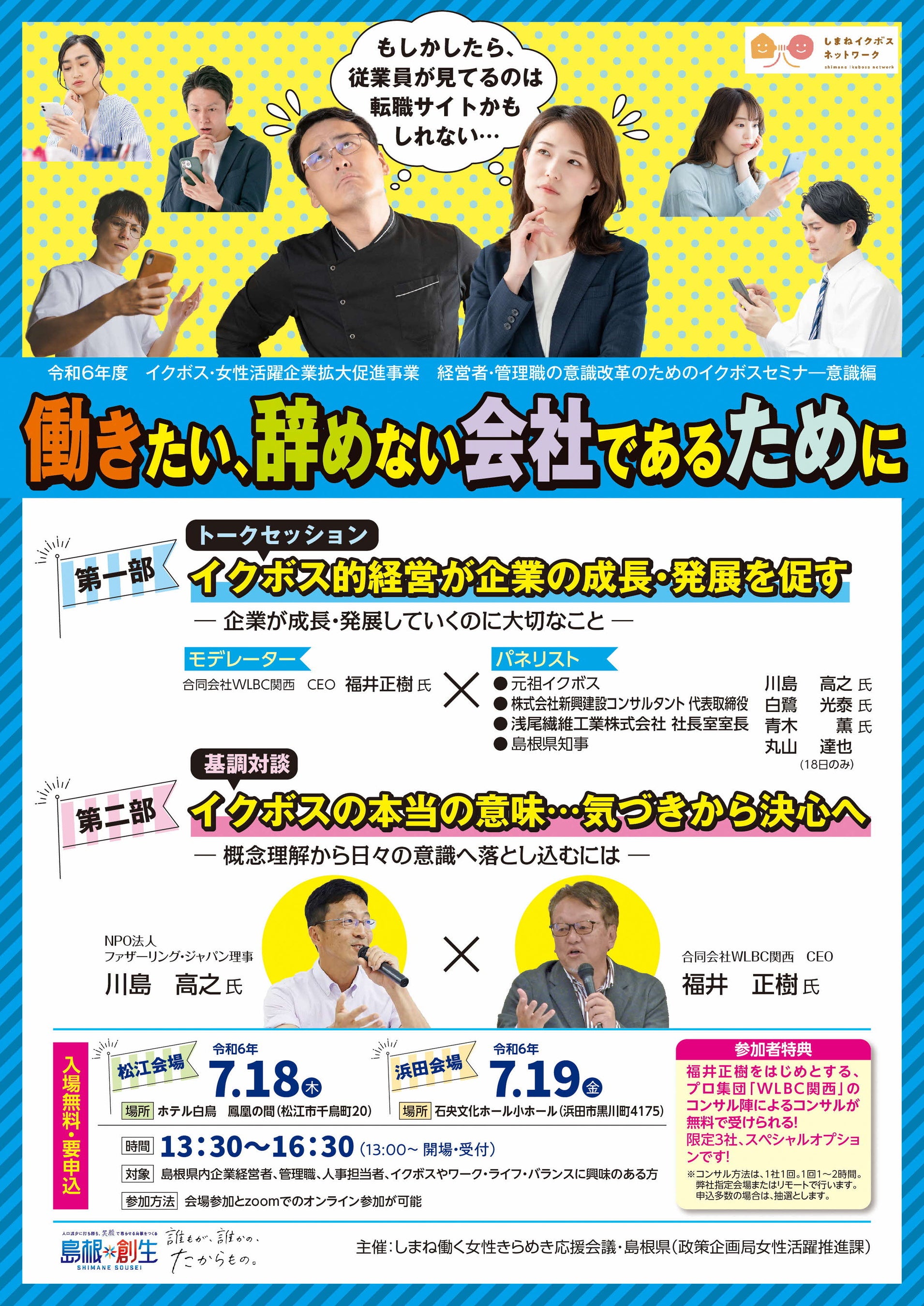 セミナーでは、丸山島根県知事も登壇し「イクボス」に取り組んでいる島根県内企業の代表者、講師のNPO法人ファザーリング・ジャパン川島高之理事によるトークセッションを行います。