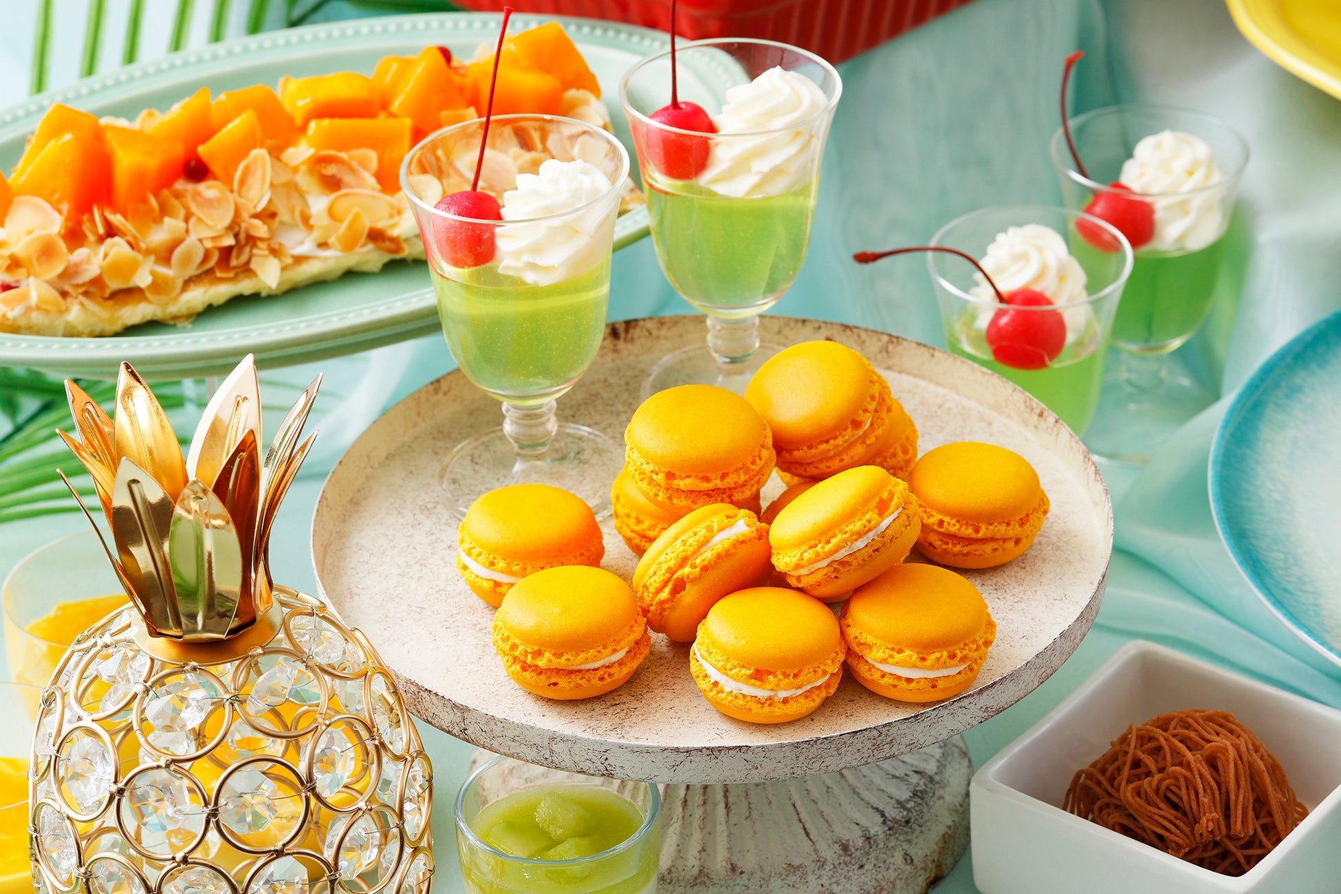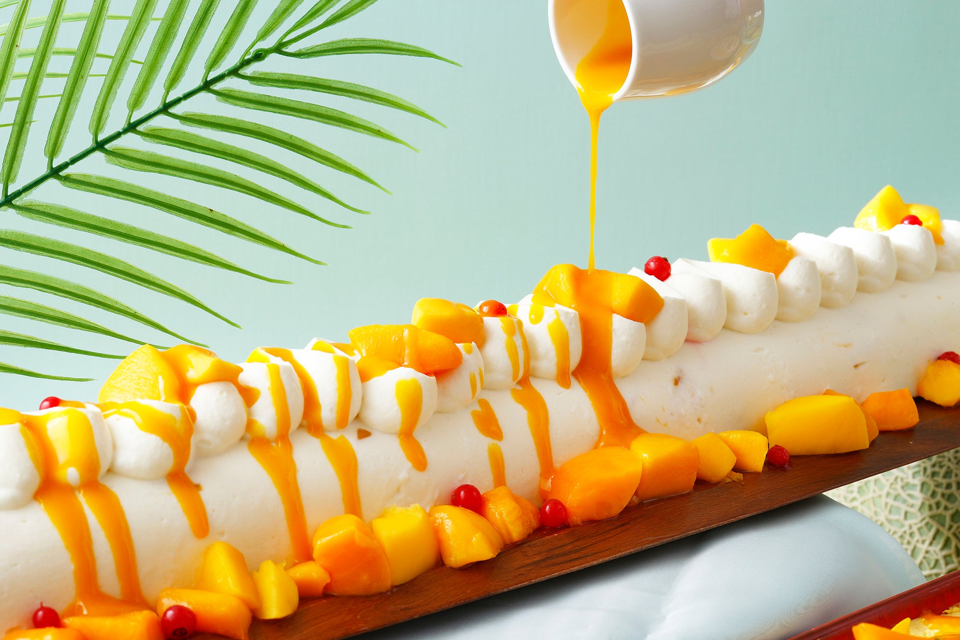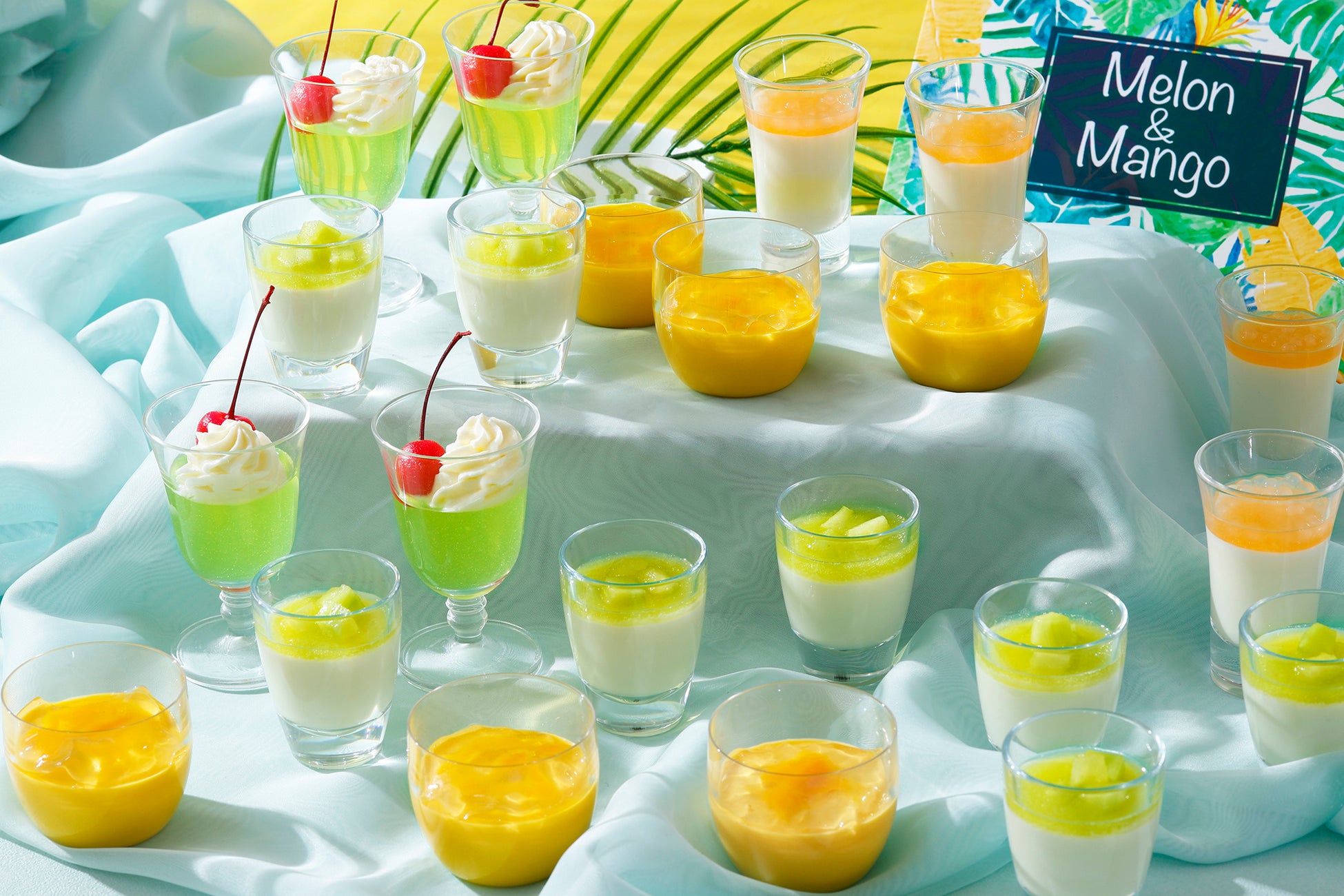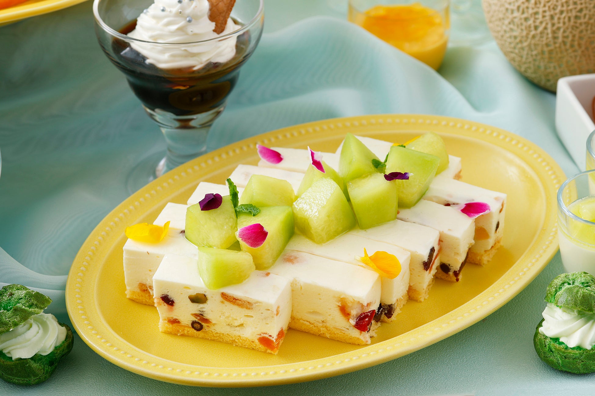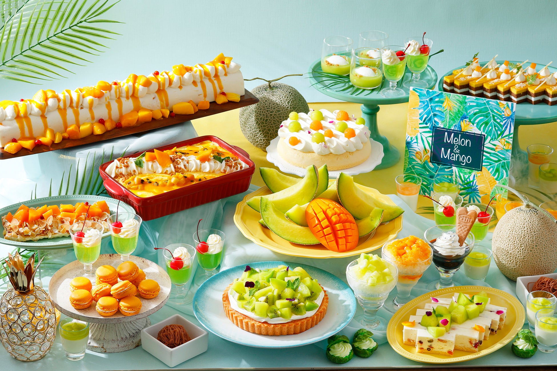 真夏のバカンス気分へと誘う本スイーツブッフェでは、甘美でみずみずしいメロンと、夏の陽射しをたっぷり浴びた芳醇なマンゴーをアレンジしたスイーツを贅沢にお楽しみいただけます。