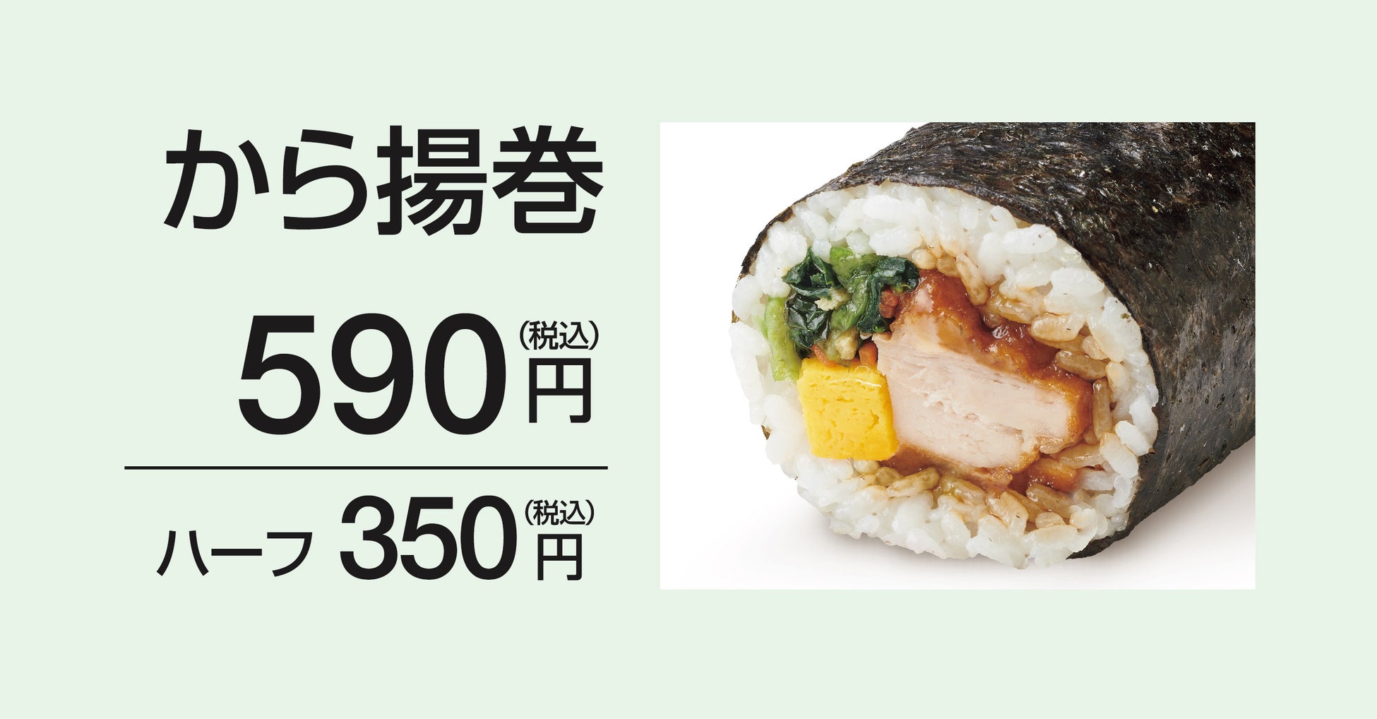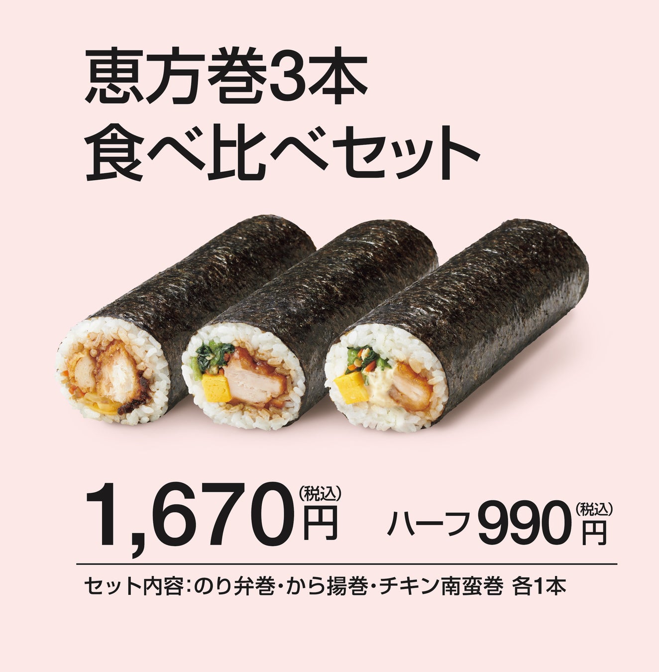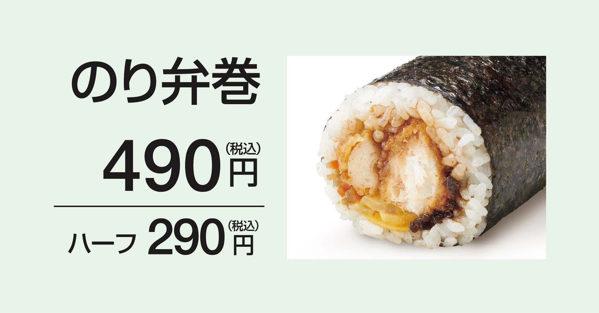 人気のお弁当を恵方巻にした「お弁当屋さんの恵方巻」は、3種類の味をお楽しみいただけます。白身フライやちくわの天ぷら、キンピラなど『のり弁当』の具材をそのまま巻いた『のり弁巻』490円、甘めのタレで味付けしたから揚や、だし巻玉子を巻いた食べ応え抜群の『から揚巻』590円、甘酸っぱいチキン南蛮と具だくさんのタルタルソースがたまらない『チキン南蛮巻』590円の3種類となっており、すべてハーフサイズもご用意しております。また、3種類の恵方巻をすべて楽しめる『恵方巻3本食べ比べセット』や、人気の豚汁とハーフサイズの恵方巻が2本セットになった『恵方巻豚汁セット』など豊富なラインアップをご用意しております。