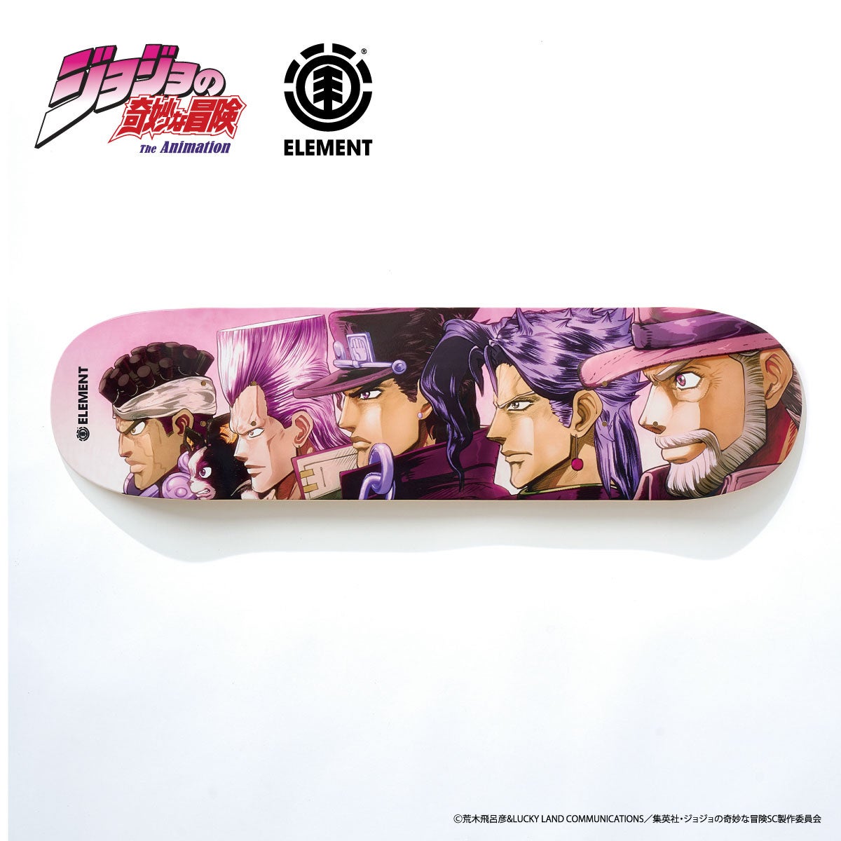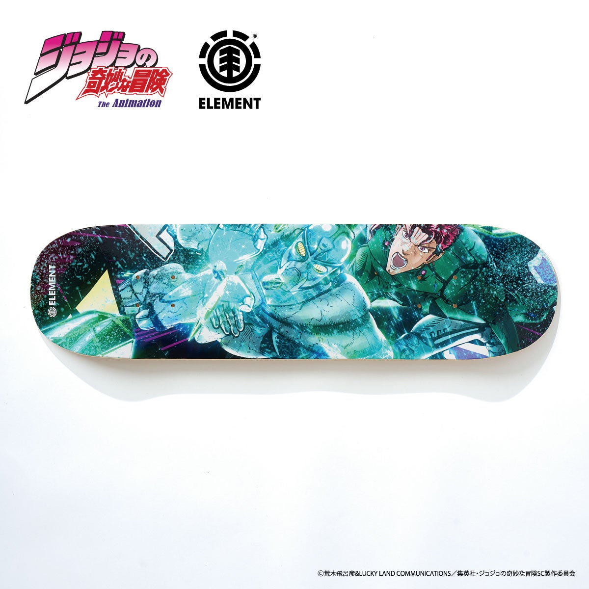 アニメ『ジョジョの奇妙な冒険 スターダストクルセイダース』とELEMENTがコラボしたスケートボードデッキがプレミアムバンダイに登場