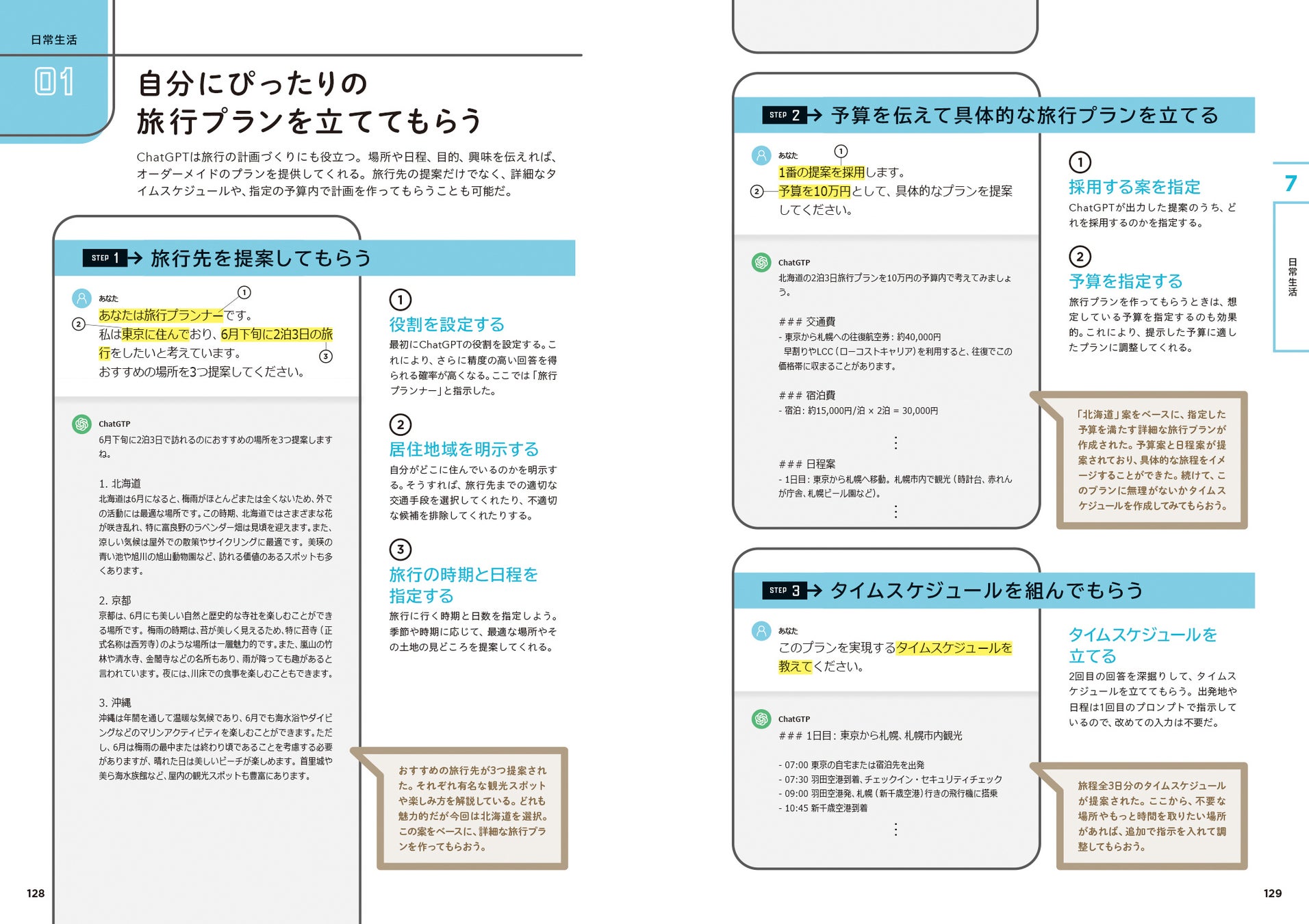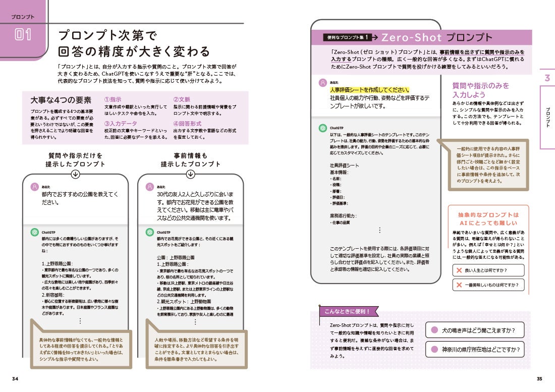 また、プロンプト文の作り方の解説パートでは、効果的なプロンプト文の形を7種類に大別して説明しており、どんな場面でどのようなプロンプト文を用いるべきかがよくわかります。