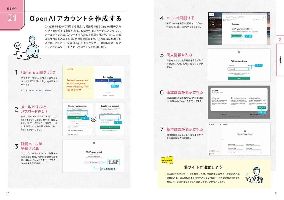 アカウントの作り方やGPTsの導入方法などについては、実際の操作画面を大きく掲載しており、PCやスマホに不慣れな方でも迷わずに手順を進めていけます。