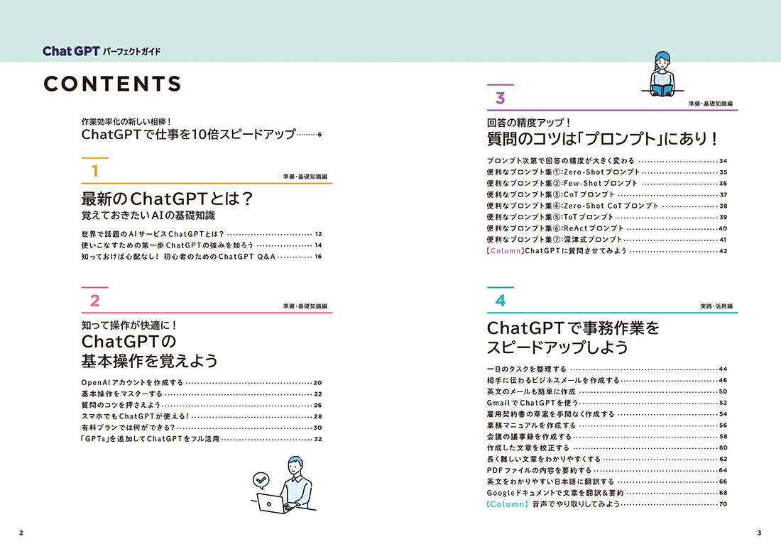 「準備・基礎知識」編と「実践・活用」編の2部構成になっており、本書を通読することで、初心者でも段階を踏んでChatGPTを使いこなせるようになります。