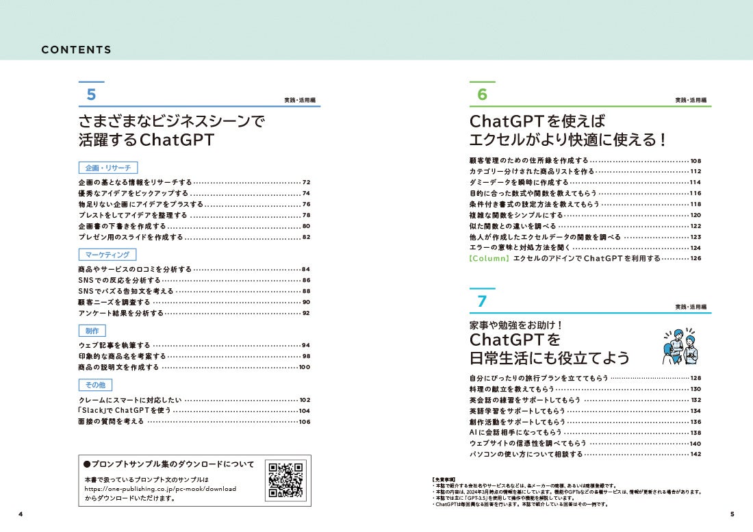 「実践・活用」編では、ビジネスシーンやプライベートでChatGPTを上手に活用する方法をシチュエーション別にまとめており、実践的なプロンプト例に触れて習熟できるほか、プロンプト例をまとめたサンプルをダウンロードすることで、すぐに作業を効率化することができます。