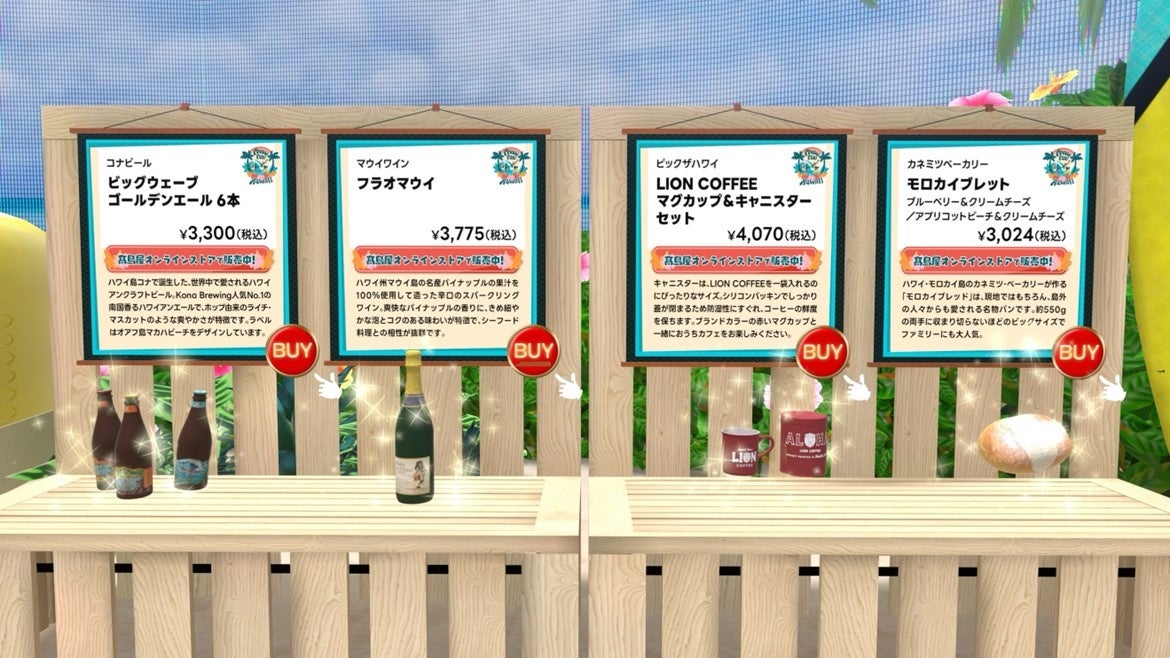 リアル店舗で開催するハワイ催事の販売商品をメタバース上からも髙島屋オンラインストアに遷移して購入できる他、リアル店舗とメタバースの相互送客を促す施策を実施。さらに、ハワイと日本を行き来して30年以上、BS12トゥエルビ「ハワイに恋して!」のMC内野亮さんによるバーチャル接客イベントも実施いたします。