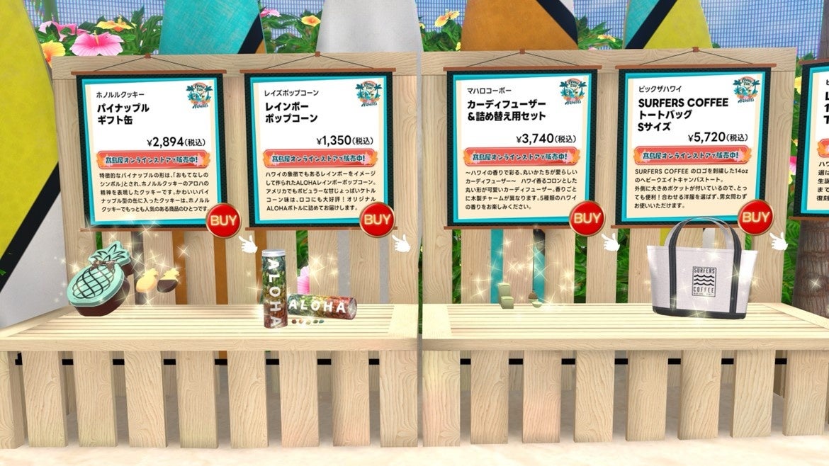 今回「パラリアル大阪」に展開する髙島屋のブースでは、ビーチやヤシの木などハワイらしさをふんだんに感じられる装飾と、リアル店舗の催事でも販売されるアロハシャツやハワイアンポップコーンなどのハワイに関連した商品を3Dモデルで展示し、気に入ったアイテムはその場から髙島屋オンラインストアに遷移し購入することが可能です。