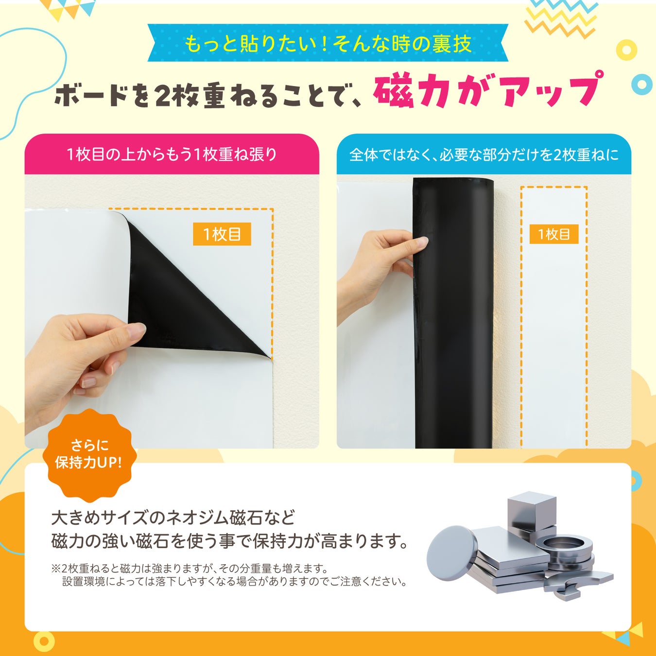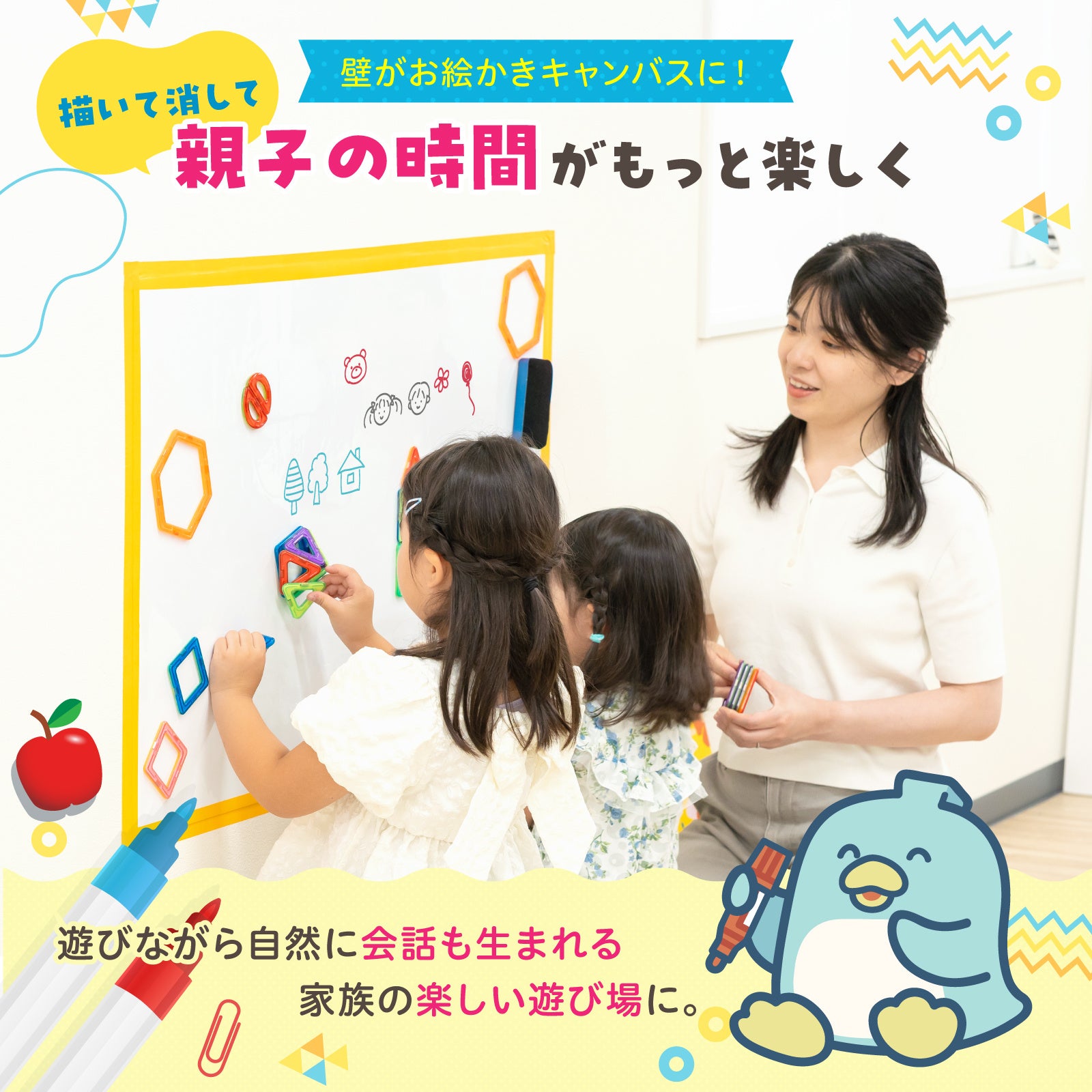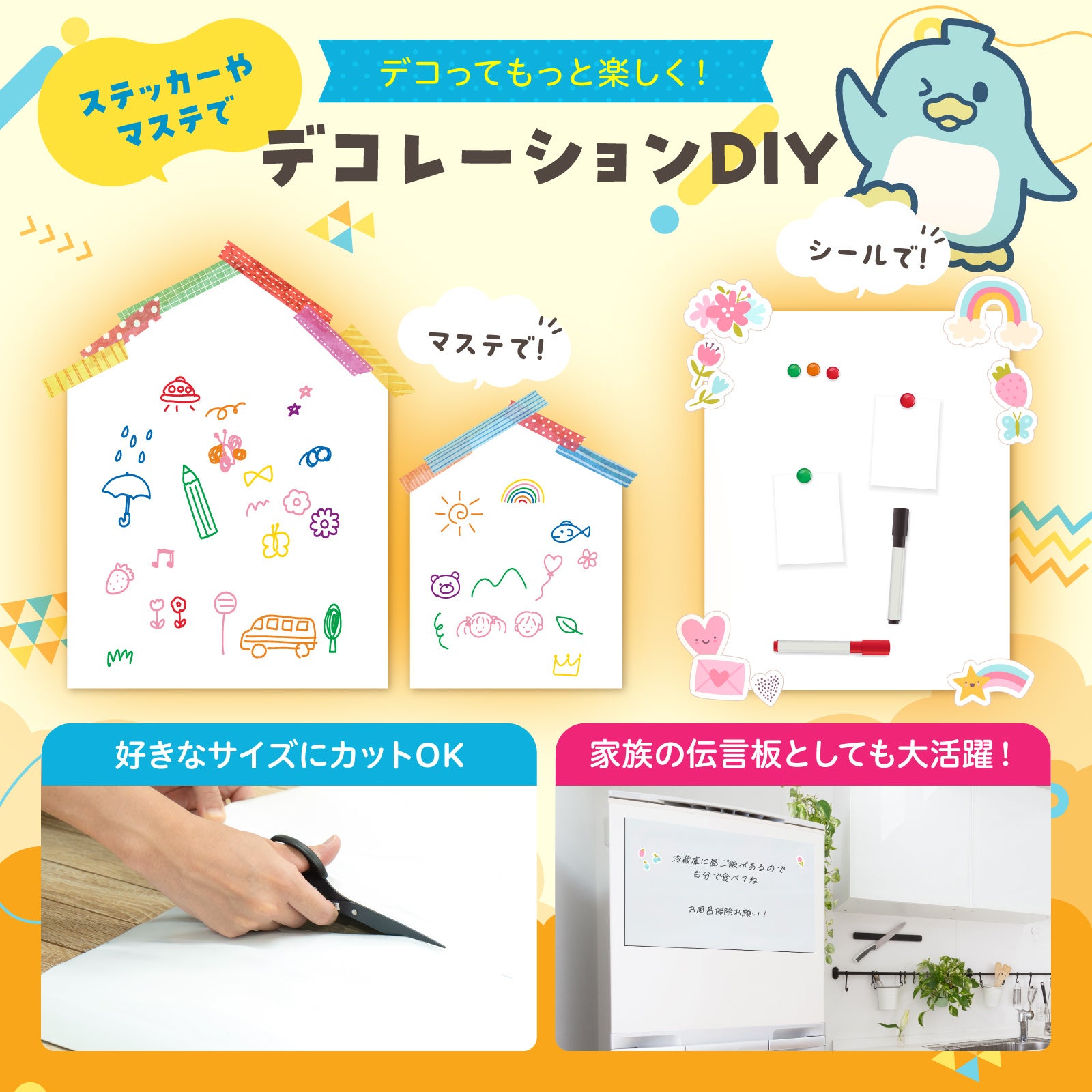 貼って剥がせる強力粘着タイプで、お子さまの落書きやお絵描き、学習スペースづくり、家族の伝言ボードなど、幅広いシーンで活躍します。