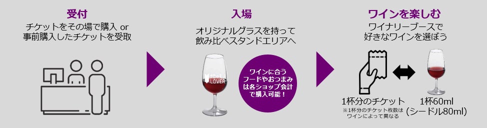 購入したチケットとワイングラスは、当日ワインスタンド受付にてお受け取りください。