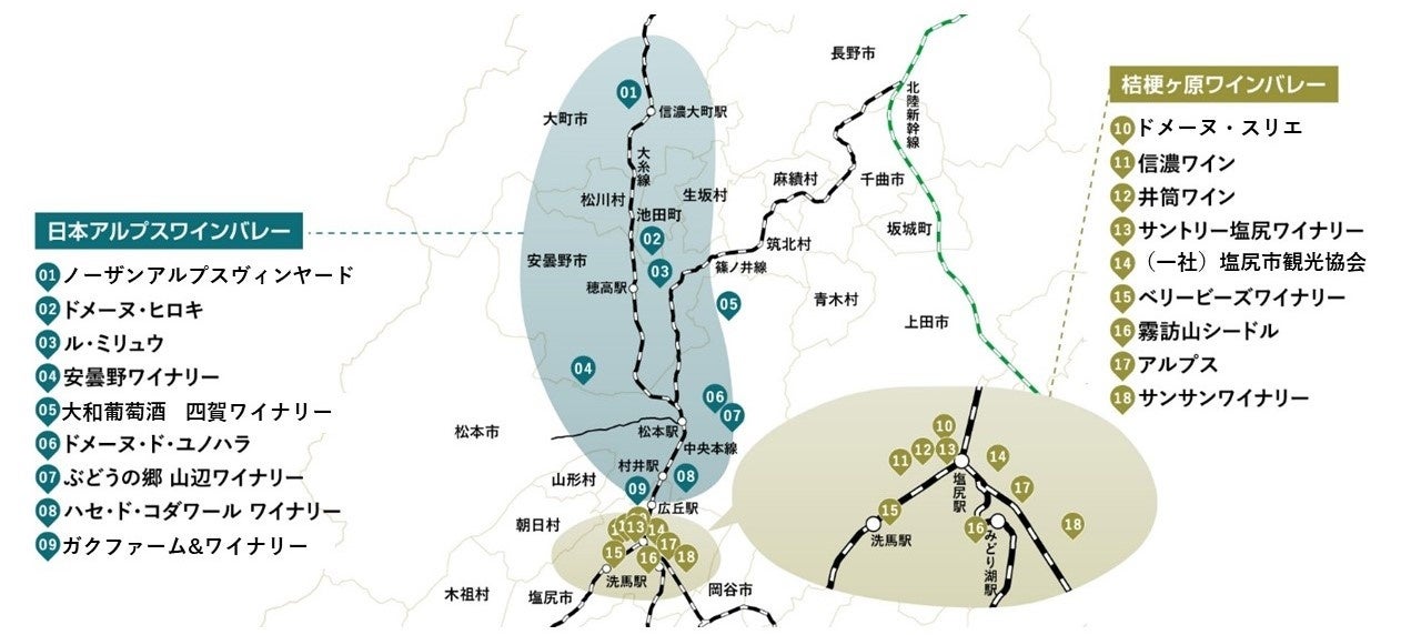 ドメーヌ・スリエ /信濃ワイン/井筒ワイン/サントリー塩尻ワイナリー/ (一社)塩尻市観光協会/ベリービーズワイナリー/霧訪山シードル/アルプス/サンサンワイナリー