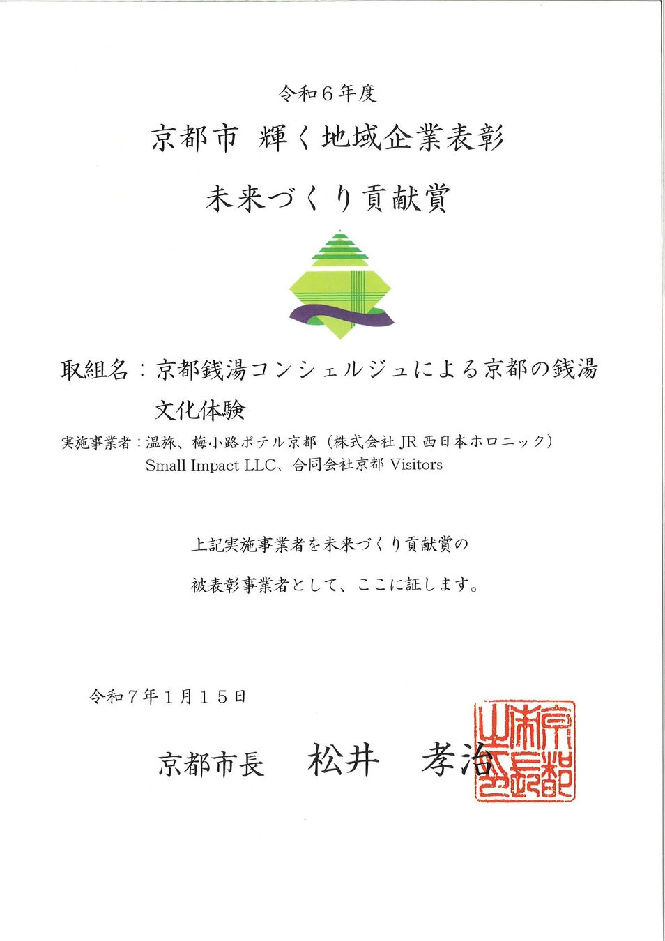 京都市輝く地域企業表彰。未来づくり貢献賞