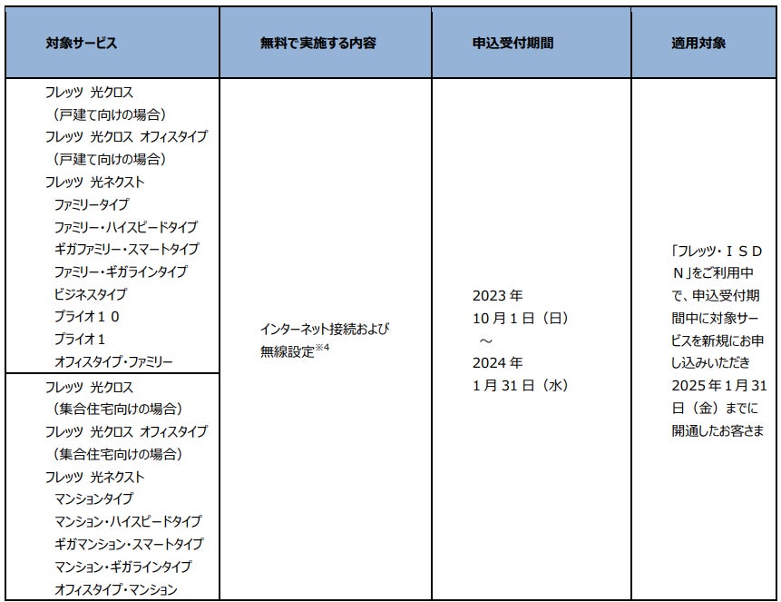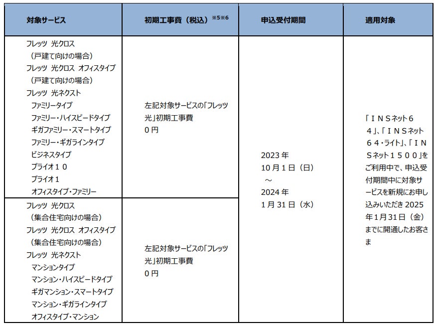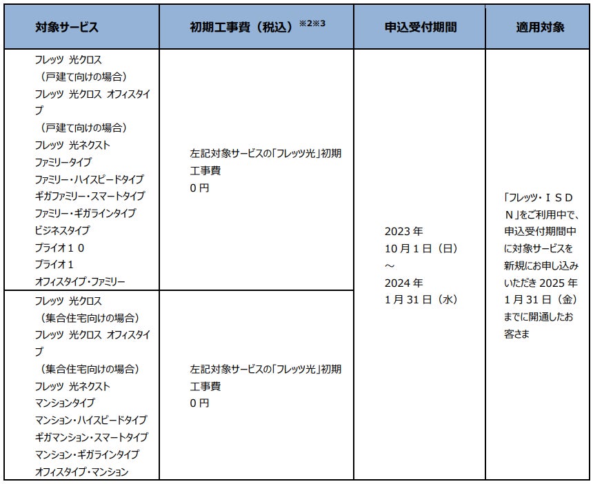 (1)「フレッツ・ISDN」、「INSネット64」、「INSネット64・ライト」、「INSネット1500」、「『フレッツ光』初期工事費を無料とすることに合意した当社以外の事業者さまが提供するADSLサービス」または「『フレッツ光』初期工事費を無料とすることに合意した事業者さまが提供するCATVインターネット接続サービス」※1より「フレッツ 光クロス」、「フレッツ 光ネクスト」へ移行する場合の工事費等の無料