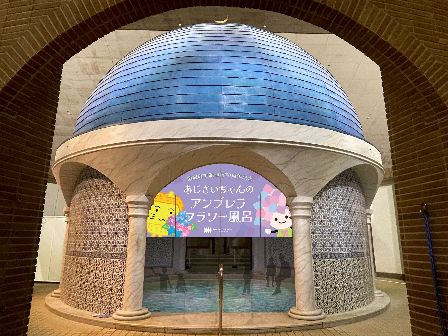 本企画は、藤田観光株式会社の会社設立 70 周年と、開成町町制施行 70 周年という節目の年を迎えたことを記念し、両者のコラボレーションが実現しました。第1弾では、ユネッサンのオフィシャルホテル「箱根ホテル小涌園」に於いて、開成町の伝統行事「瀬戸屋敷ひなまつり」のつるし雛を展示いたしました。第2弾となる今回は、開成町があじさいの名所であり、梅雨の風物詩でもあることにちなみ、ユネッサンにあじさいをテーマにしたお風呂を登場させます。湯船から見上げると、ドーム型の天井にはあじさいの花と葉をイメージした「青」「緑」「赤」「紫」の4色の傘と、あじさいちゃん(開成町公式マスコットキャラクター)の傘がカラフルに彩られ、あじさいが空から咲きこぼれてくるような気分をお楽しみいただけます。