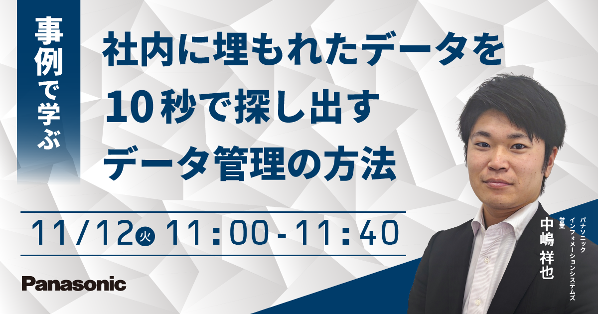 パナソニック インフォメーションシステムズ株式会社は、2024年11月12日(火)『事例で学ぶ 社内に埋もれたデータを10秒で探し出すデータ管理の方法』セミナーを開催します。