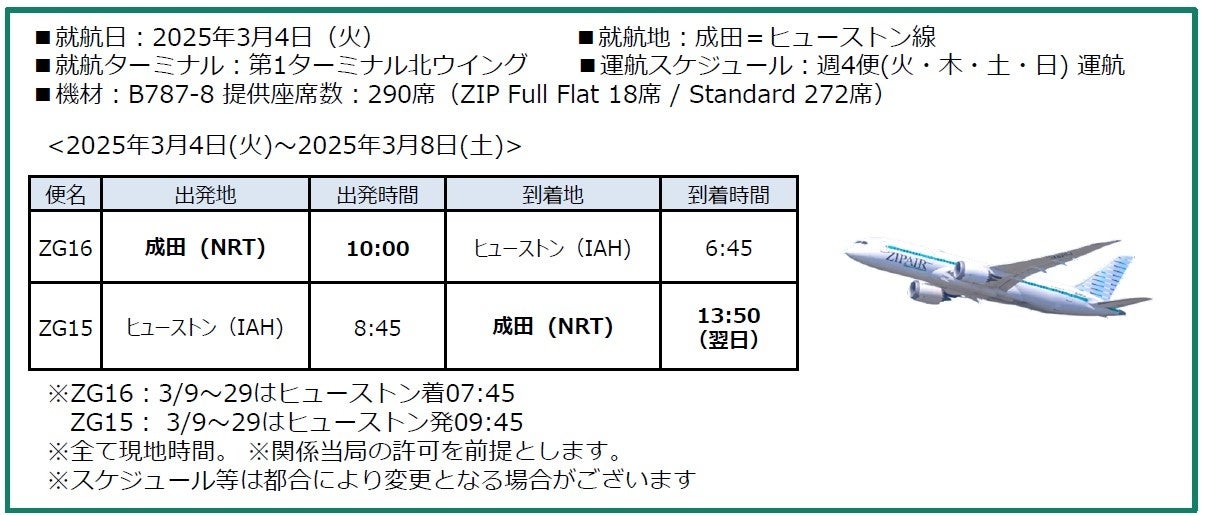 ZIPAIR(IATAコード:ZG)は、2025年3月4日(火)より、定期旅客便として成田=ヒューストン線に