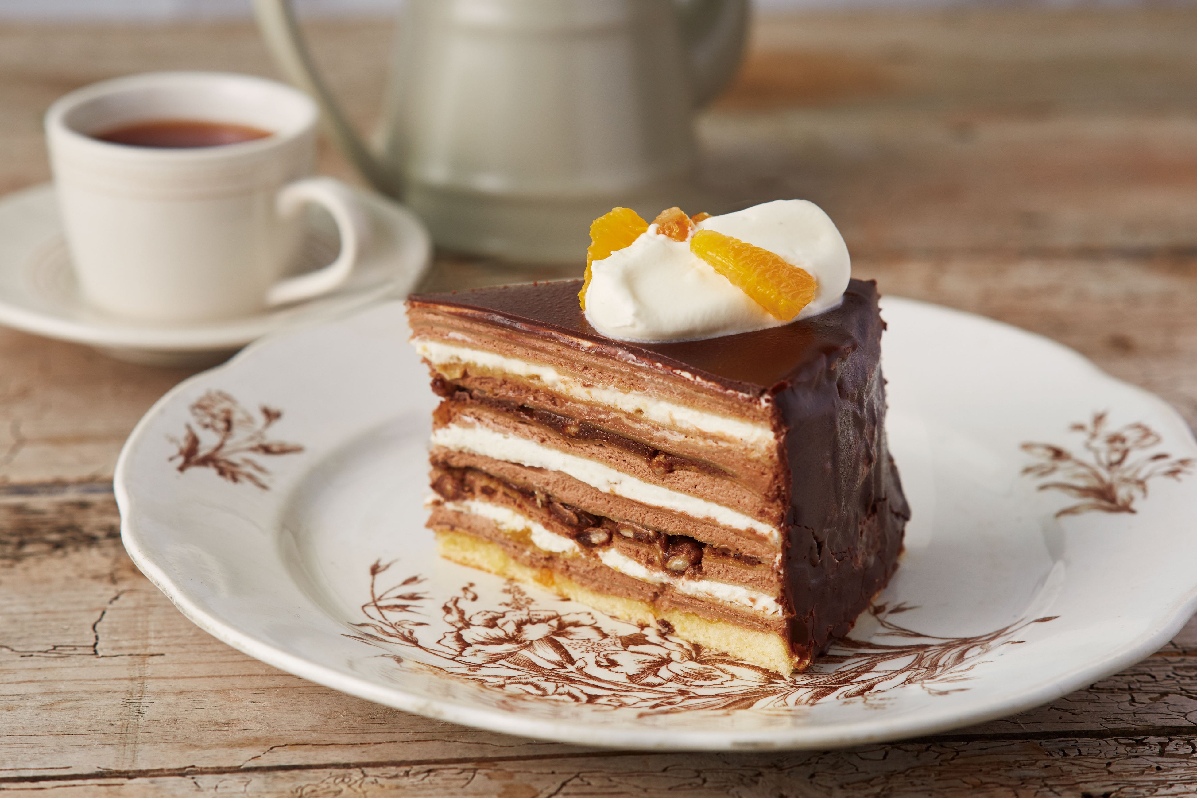ベルギーのカレボー社製スイートチョコを使用したチョコレートクリームとヘーゼルナッツプラリネチョコを重ねた濃厚なミルクレープ。オレンジピールとフレッシュオレンジをトッピング。