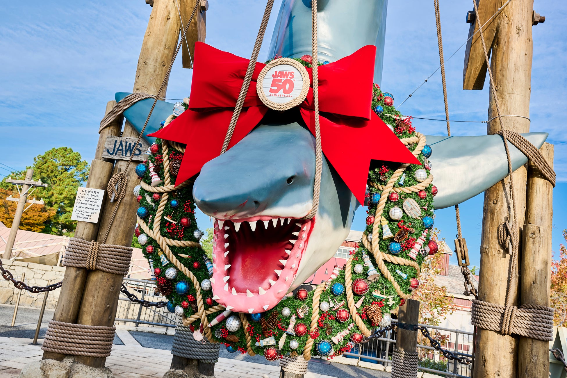 不朽の名作映画「ジョーズ」の日本での映画公開50周年(1975年12月6日初公開)を記念したアニバーサリー・イベント『ジョーズ・セレブレーション』【開催期間:11月19日(水)~2026年1月4日(日)】も、明日から開幕、パーク開業時から人気の『アミティ・ビレッジ』全体がお祝いムードにあふれます。50周年限定のクリスマス・リースが飾られたハンキング・シャークでの記念撮影や、アトラクション『ジョーズ』のボートツアーでの特別なアナウンス、テーマレストランのメニューリニューアルなど、パークだけの特別な「ジョーズ」の世界をゲストの皆さまは満喫しました。