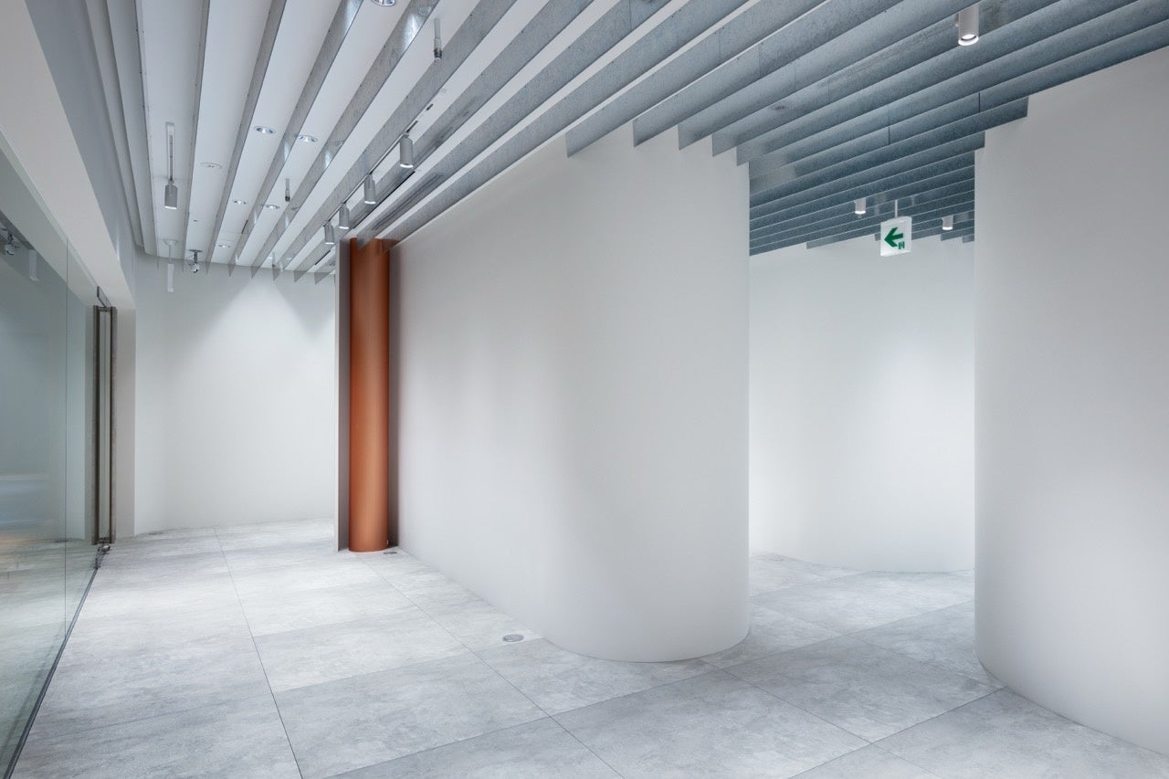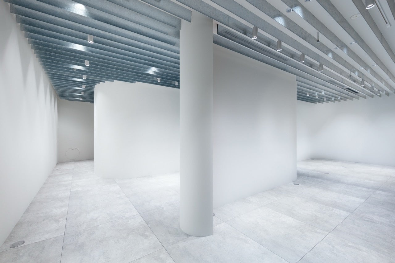集英社マンガアートヘリテージ トーキョーギャラリーの壁面は「印刷機の中を紙が通る様子」をコンセプトに、白い曲面で構成され、グラビア印刷機の円柱状の刷版をイメージした金属色の円柱が配されています。この空間を生かした展示空間となります。