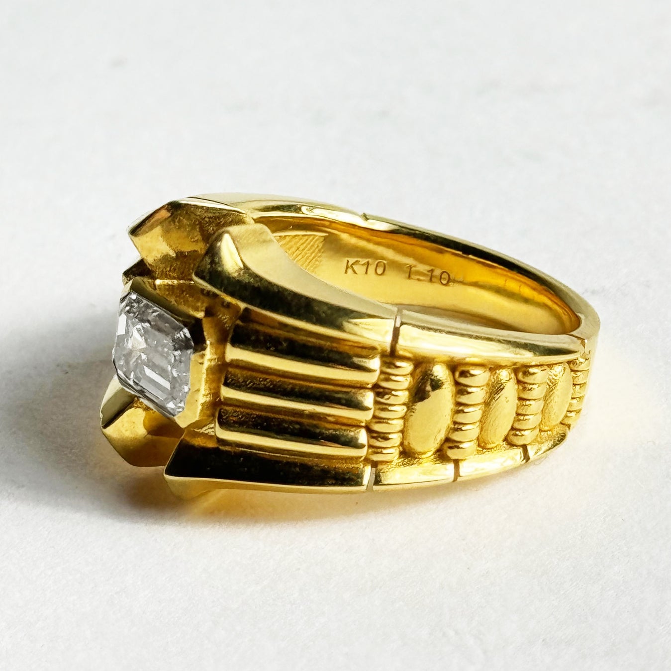 リングには K10イエローゴールドを18.9g 使用しています。K18より硬めで傷がつきにくく、普段使いのリングとしても取り扱いやすい点がメリットです。落ち着いた色味で肌に馴染みやすく、ダイヤモンドの透明感を邪魔しません。リング内側には素材刻印が入り、品質が確認できます。