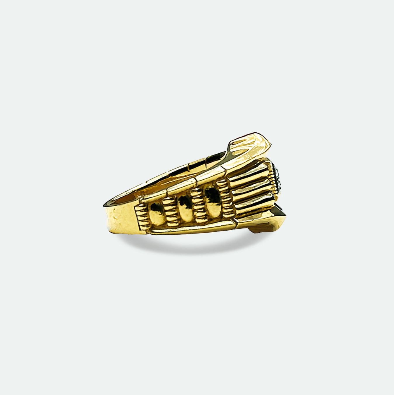 直線的な形状と高さのある石座が特徴で、ダイヤモンドの輪郭がしっかり見えるデザインです。装飾を多く入れず、石とゴールドの質感をそのまま楽しめる仕上がりになっています。