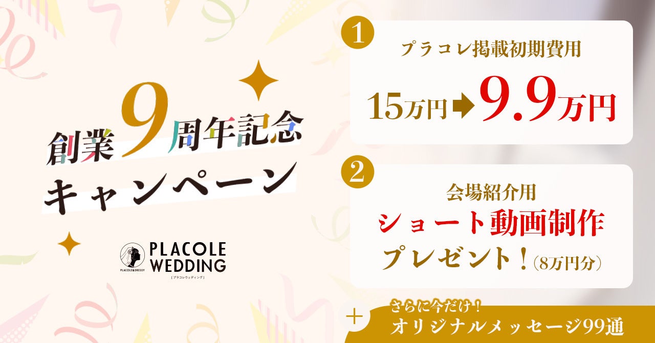 この度、プラコレは皆様のご愛顧のおかげで9周年を迎えることができました。これを記念して、より多くの新郎新婦様に理想の結婚式との出会いを提供するため、創業当初から展開している「プラコレウェディング」にて、特別なキャンペーンを実施いたします。