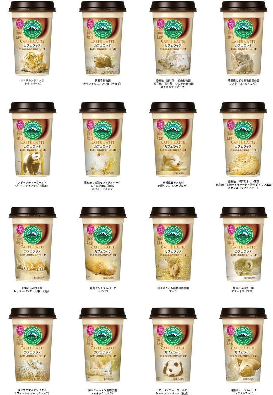 ① 飼育員が撮影した動物たちの寝顔の写真をパッケージに採用した「マウントレーニア カフェラッテ」~深い癒やし動物お昼寝パッケージ~を販売