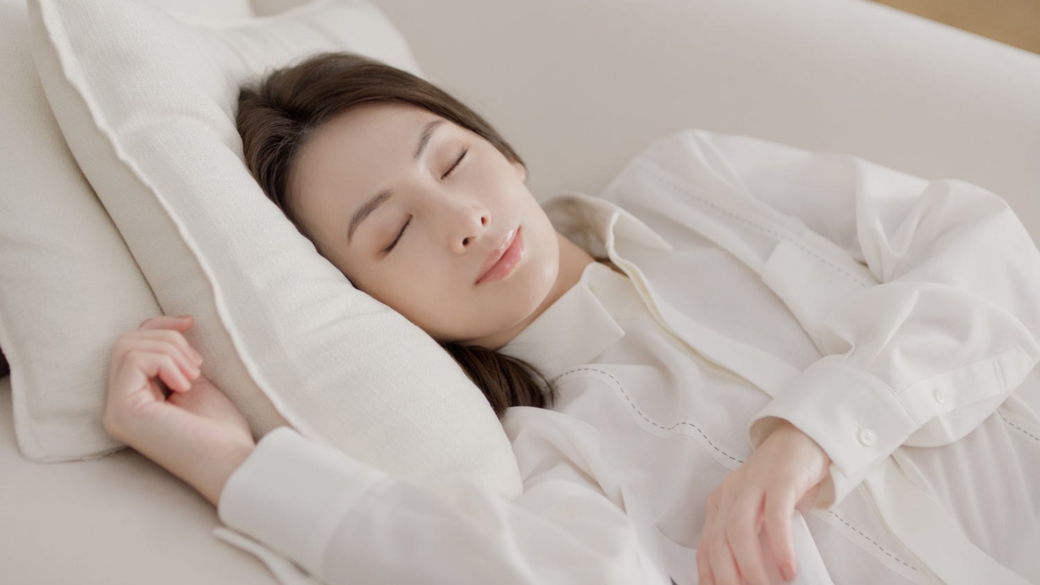 清潔感のあるくつろげるお部屋で静けさに身をゆだね、うたた寝をしていた北川さんが目を覚ますと、伸びながら深呼吸をして、つい「気持ちいい」と心の声がこぼれる様子を描いています。