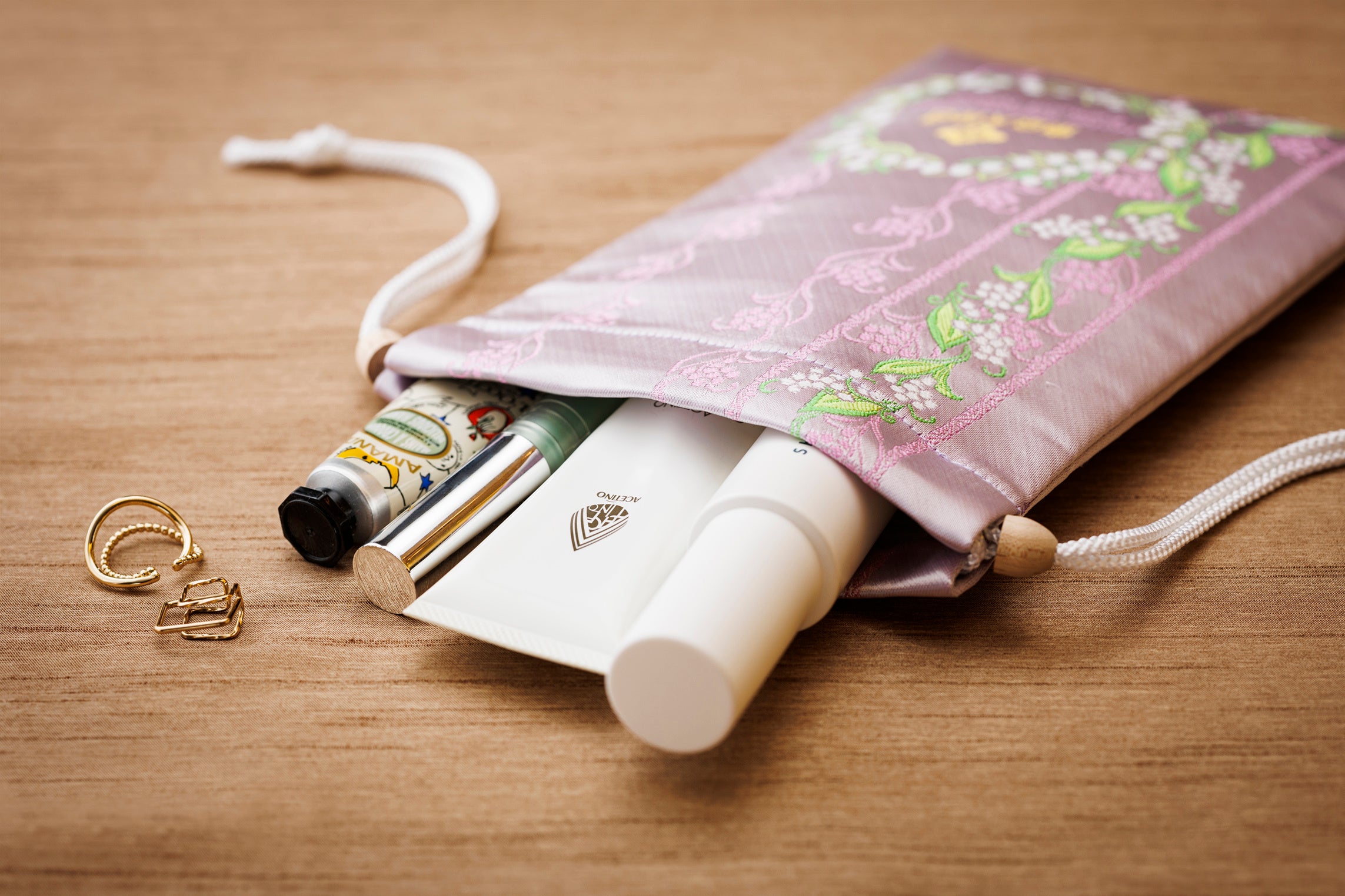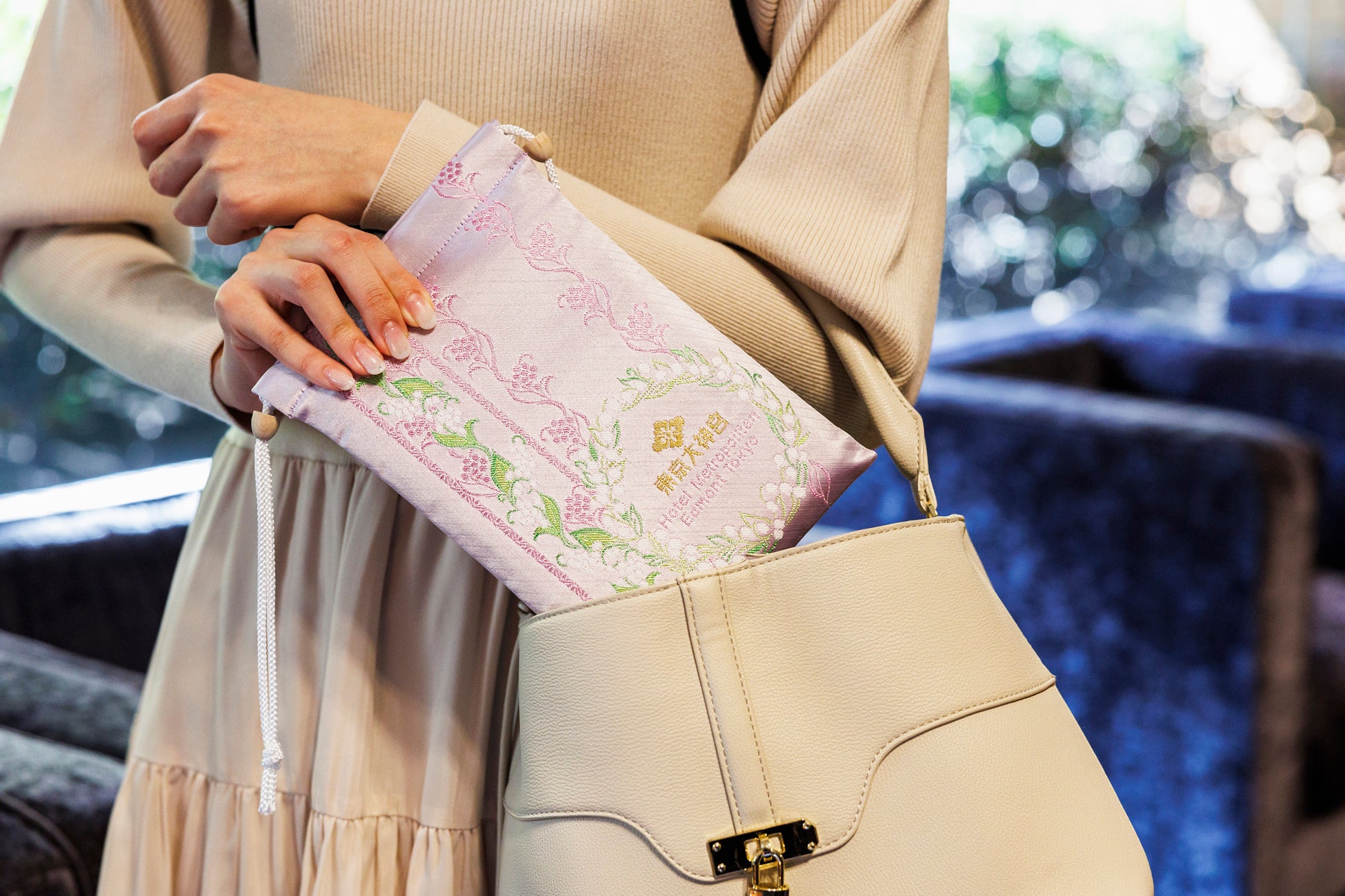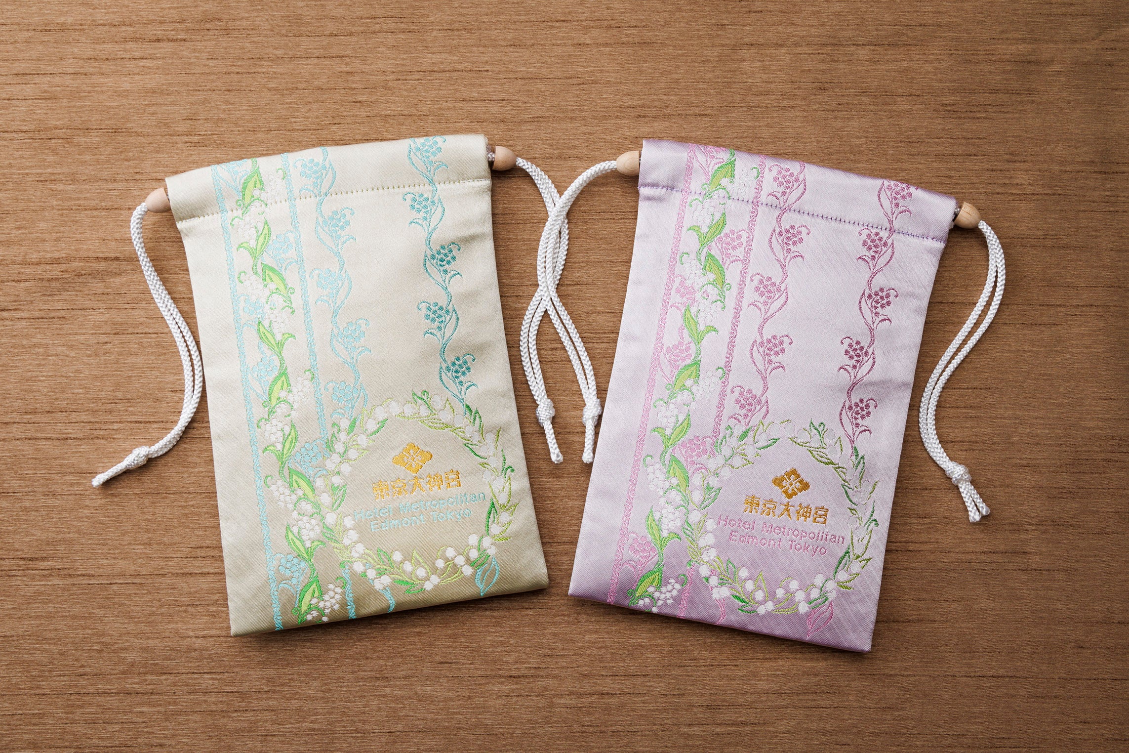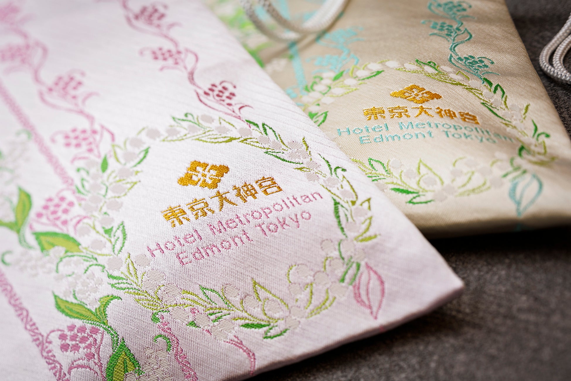 ホテルから徒歩約5分の東京大神宮は、伊勢神宮の神様を祀ることから“東京のお伊勢さま”と親しまれ、縁結びにご利益がある神社として知られ、多くの参拝者が訪れています。東京大神宮のお守りの中でも抜群の人気を誇る「縁結び鈴蘭守」にちなみ、お守りにも用いられている京都西陣織に「鈴蘭」のデザインを施した、オリジナルの御朱印帳袋を本プランのためにご用意しました。“幸福が訪れる”という花言葉を持つ「鈴蘭」がモチーフの収納袋に大切な御朱印帳を入れて御朱印めぐりをんだり、また小物や手帳を入れて普段使いするのもおすすめです。
