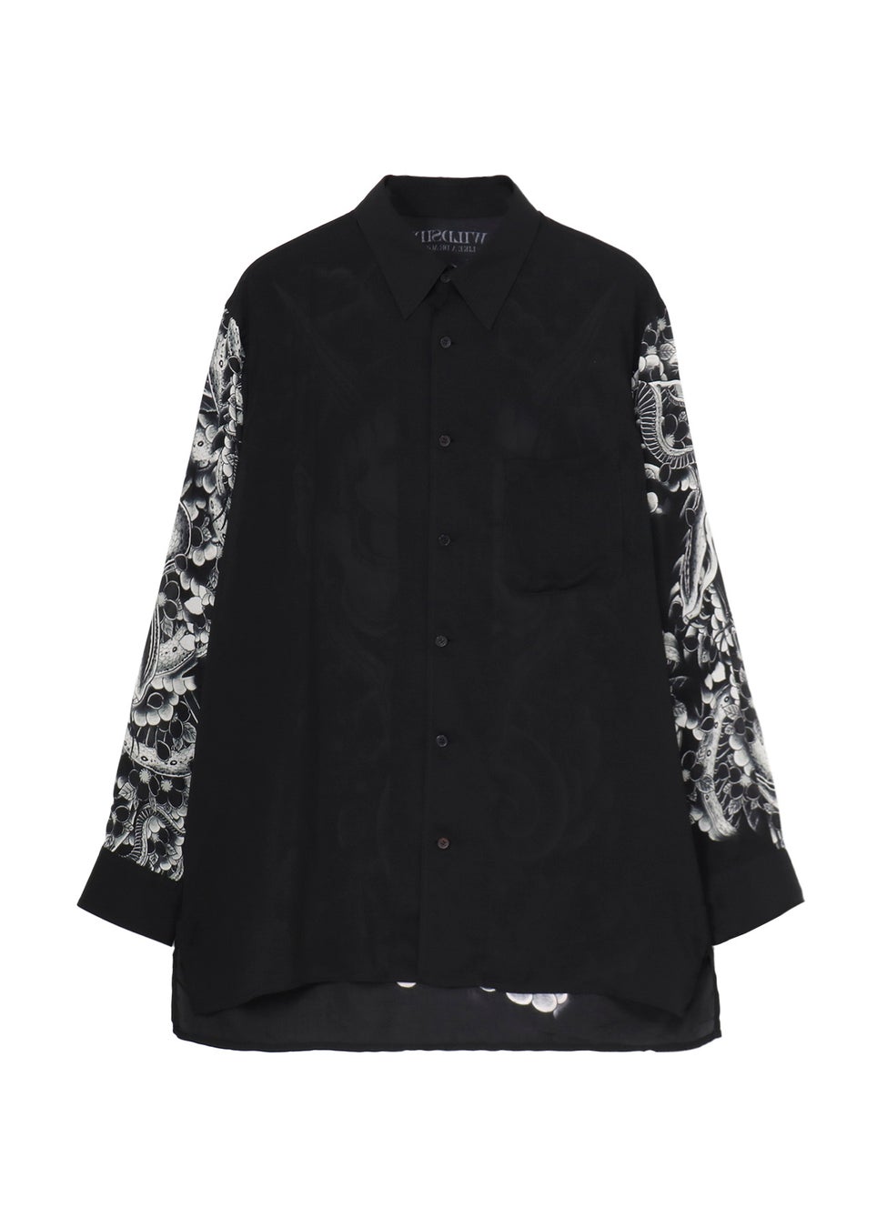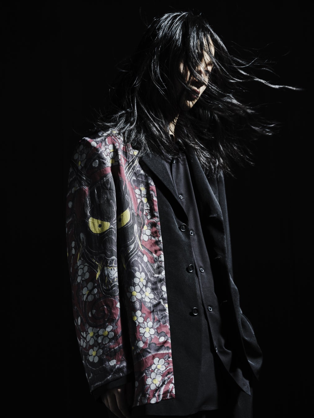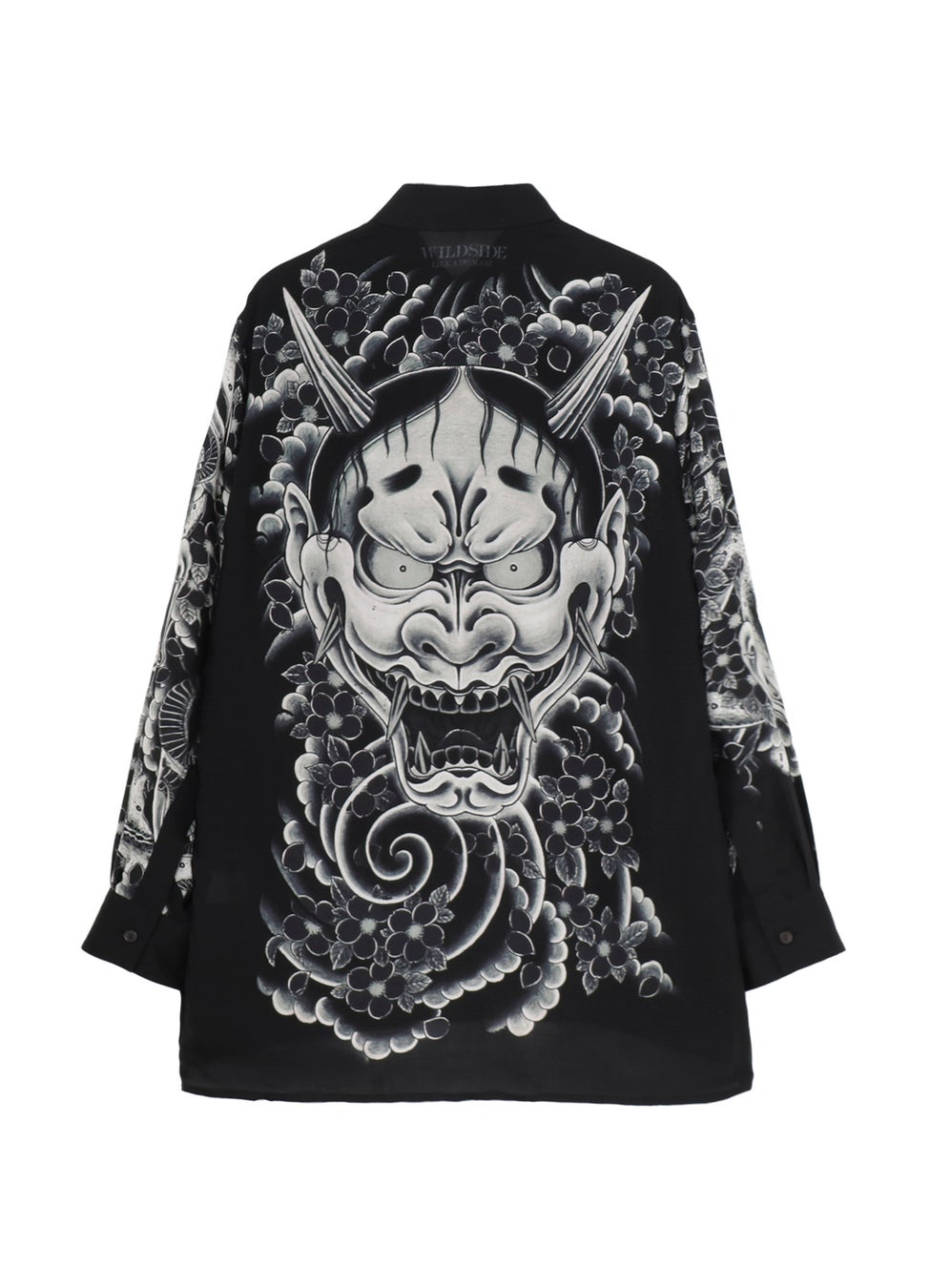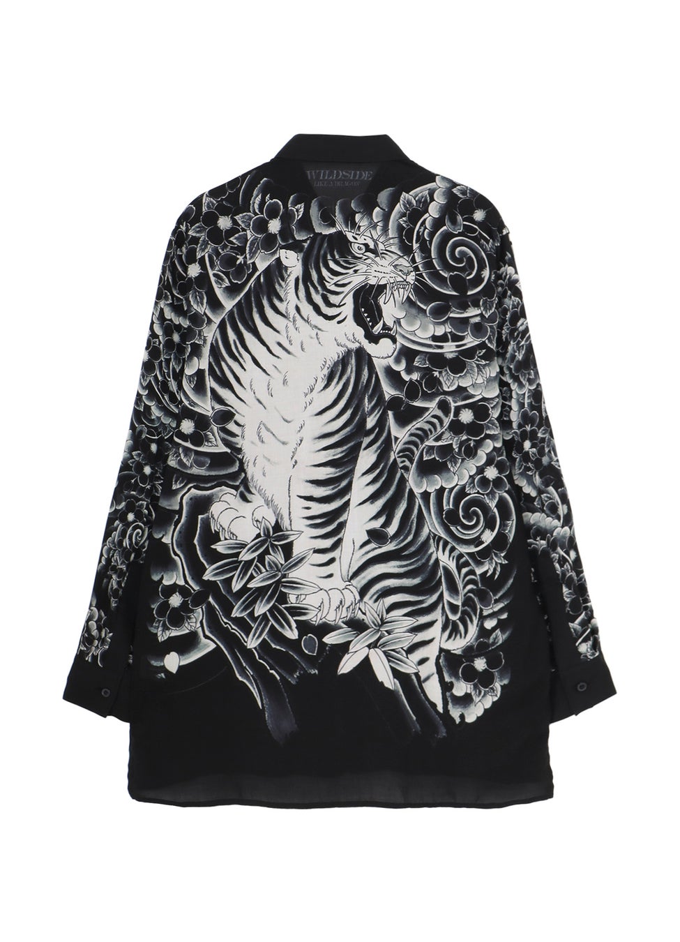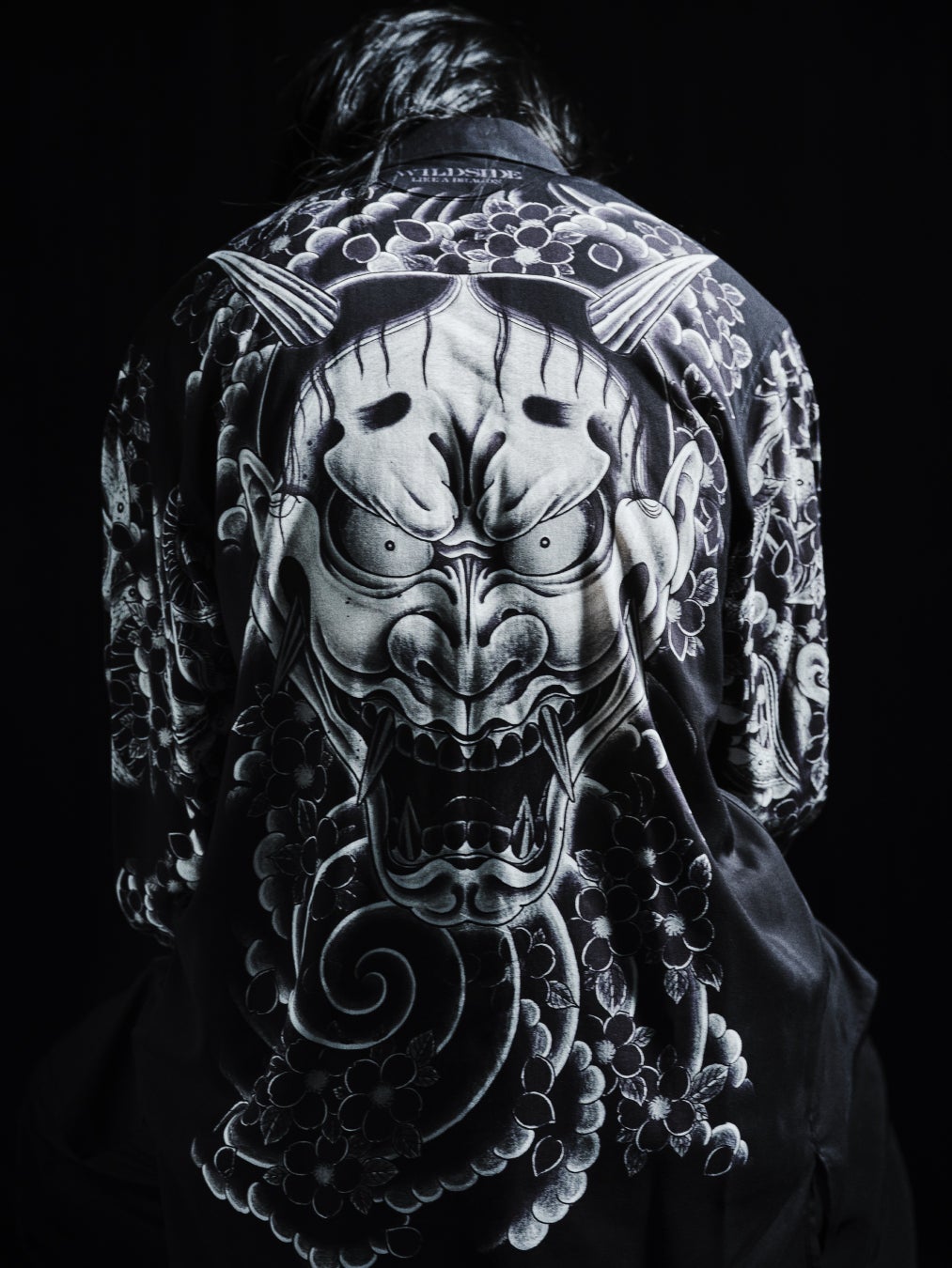 「般若」と「虎」の刺青柄を背中から袖にかけて大胆にプリントしたレーヨン素材のシャツは、白い生地を黒へとプリントをしながら柄を表現することで、柄の細やかな表情を再現しています。