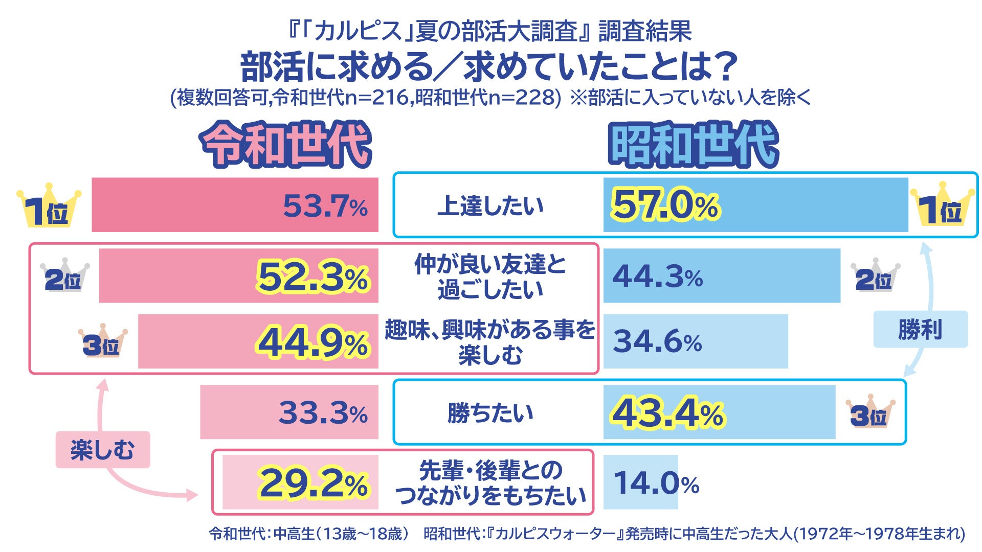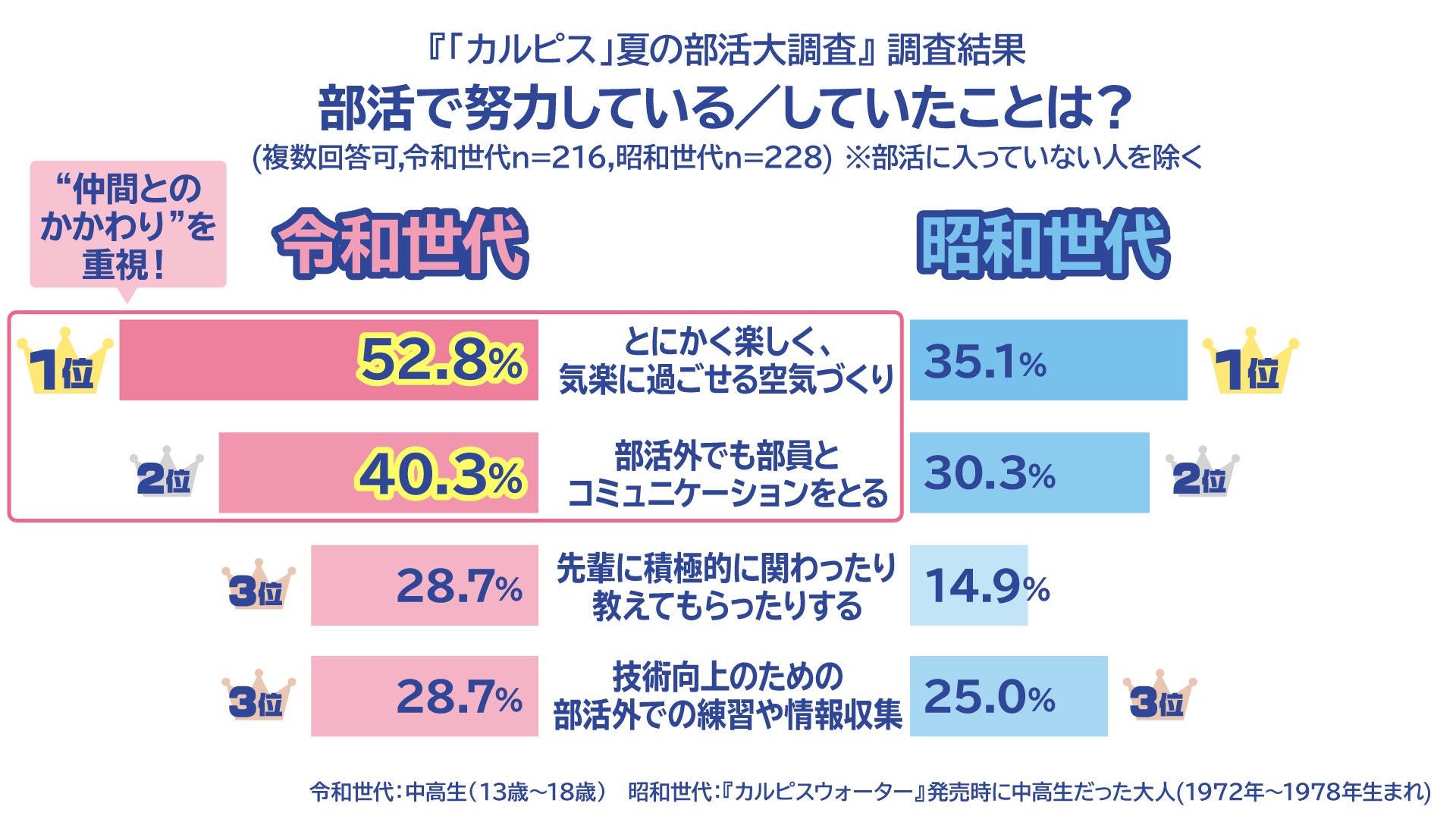 また、中高生300名を対象に「部活に対する今どきマインド」に関するインターネット調査を実施するとともに、『カルピスウォーター』が発売された1991年当時中高生だった現在46歳から52歳になる300名にも同様の調査を行い、部活に対するマインドの世代間ギャップも明らかとなりました。