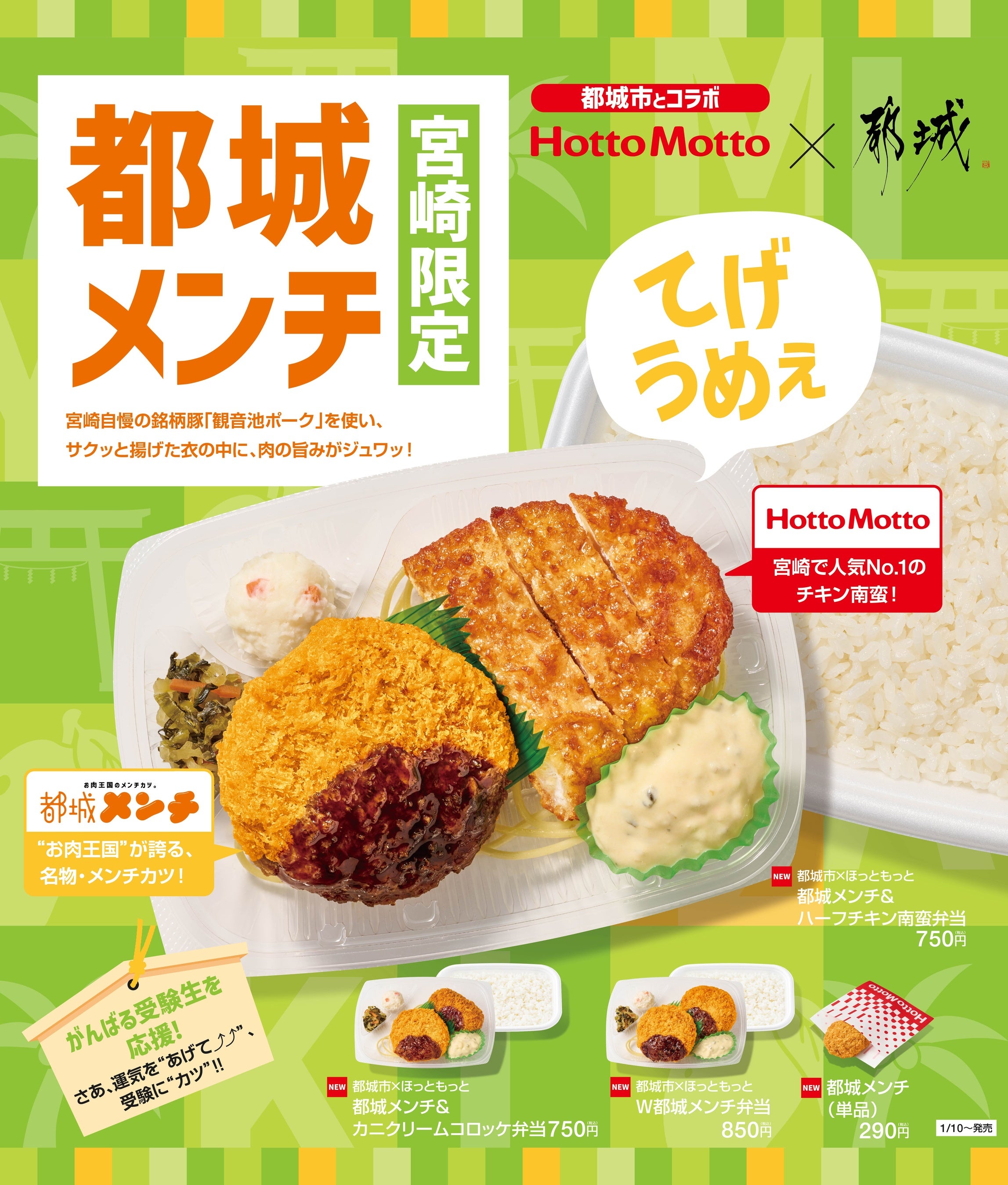 このたび「ほっともっと」では、宮崎県都城市の特産品「都城メンチ」を使用した新商品4種を、2025年1月10日(金)より宮崎県限定で新発売いたします。博多大丸の地域活性化プロジェクト「九州探検隊」と、「肉用牛、豚、鶏」の合計産出額日本一(※1)を誇る畜産王国「都城市」、そして「ほっともっと」が連携し、「都城メンチ」のおいしさを地元宮崎県のお客様に知っていただきたいという想いから、「ほっともっと」らしさを詰め込んだお弁当として販売いたします。