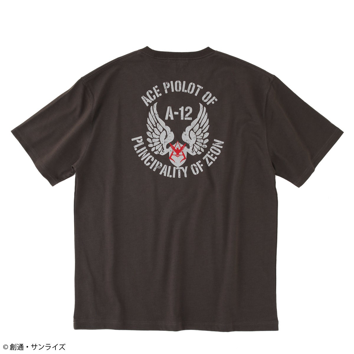 しっかりしたハニカムワッフル素材を使用した半袖Tシャツは、素材感を楽しんでいただけるようにシンプルなデザインで、フロントは左裾にワンポイントプリント、左袖口にツイル素材を使用した刺繍のワンポイント、バックネックにもワンポイントプリントを施しました。カーキのMS-06をイメージしたモデルと、スミクロのシャアをイメージしたA-12モデルの2種展開。
