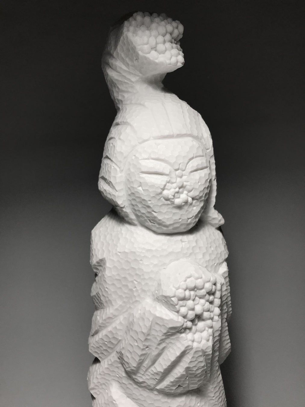 真のリアルとはなにかを追求し、まるで発泡スチロールのように石を彫り込んだ「KASHOUMON」シリーズからは、作家が円空仏のダイナミックな痕跡や手跡からインスピレーションを受けて、大理石を丁寧に彫り上げた石仏〈円空〉の新作を発表します。硬く重い天然素材の石を用いて、柔らかく軽い人工素材の発泡スチロールを表現した、人間の固定概念をくつがえすような視覚的効果を利用した超写実的な具象彫刻です。一方、“武士道と反骨精神”をテーマにして、刀をモチーフに石を極限まで削り出した「KABUKIMON」シリーズは、近代日本を形作ってきた何世紀にもわたる伝統に敬意を払いながら、彫刻の伝統的な美しさとサブカルチャー風の想像力を融合させた唯一無二の作品です。本展では大理石に水墨で龍と虎を描いた新作〈太刀壱〉を公開します。