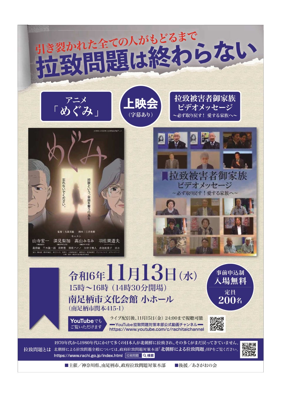 アニメ「めぐみ」等上映会を南足柄市で開催します!