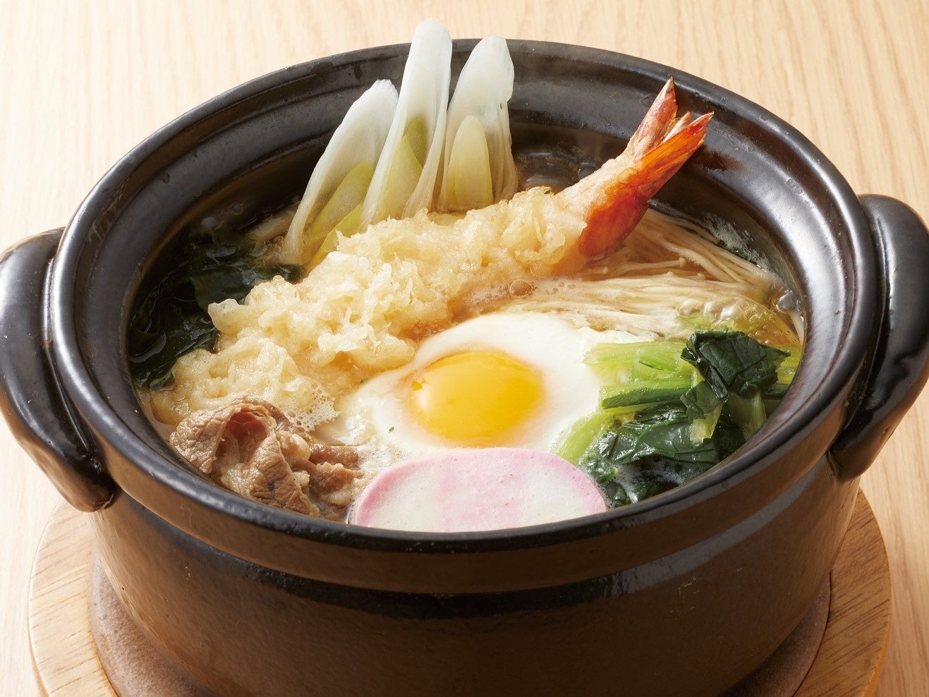 湯気が立ち上る関西風かつおだしに、大海老天、牛肉、玉子、白ネギをのせた王道の「鍋焼きうどん」は、この季節にぴったりの一品です。