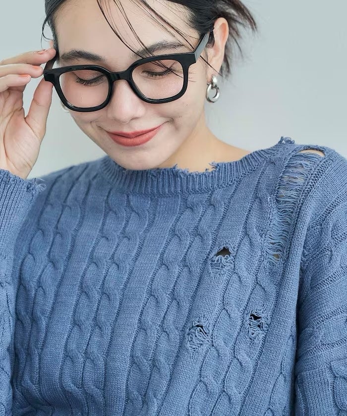 ベーシックなケーブルニットにダメージ加工を施したユニークな一着