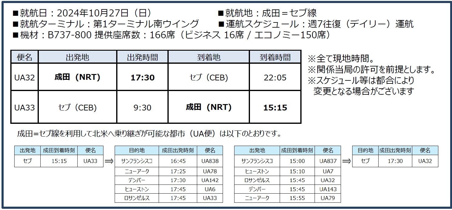 ユナイテッド航空(IATAコード、UA)は、2024年10月27日(日)より、定期旅客便として成田=セブ線に就航します。