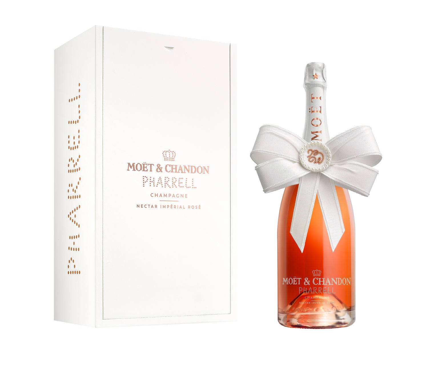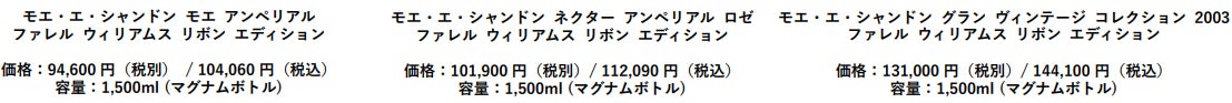 また、ファレル・ウィリアムスがデザインした1.5Lのマグナムボトル「リボン エディション」も、ポップアップストアだけで数量限定で発売いたします。ボトルネックを飾るパールビーズをあしらった特大のリボンは、アクセサリーとしても使えるファッショナブルなアイテム。「モエ アンペリアル」、