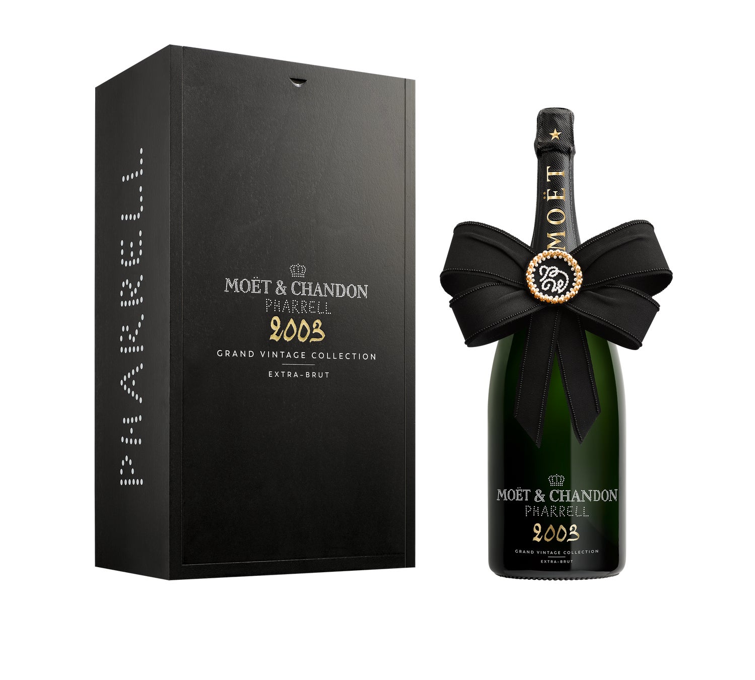 ポップアップストア限定で発売される、1.5Lのマグナムボトルをファレル・ウィリアムスのデザインで装飾した「リボン エディション」。パリの刺繍工房アトリエ・バケ・モリニエ (Atelier Baqué Molinié) が手掛けた、パールビーズをあしらった特大のファブリック製リボンが特徴的。この特別なリボンはアクセサリーとしてもお楽しみいただけます。