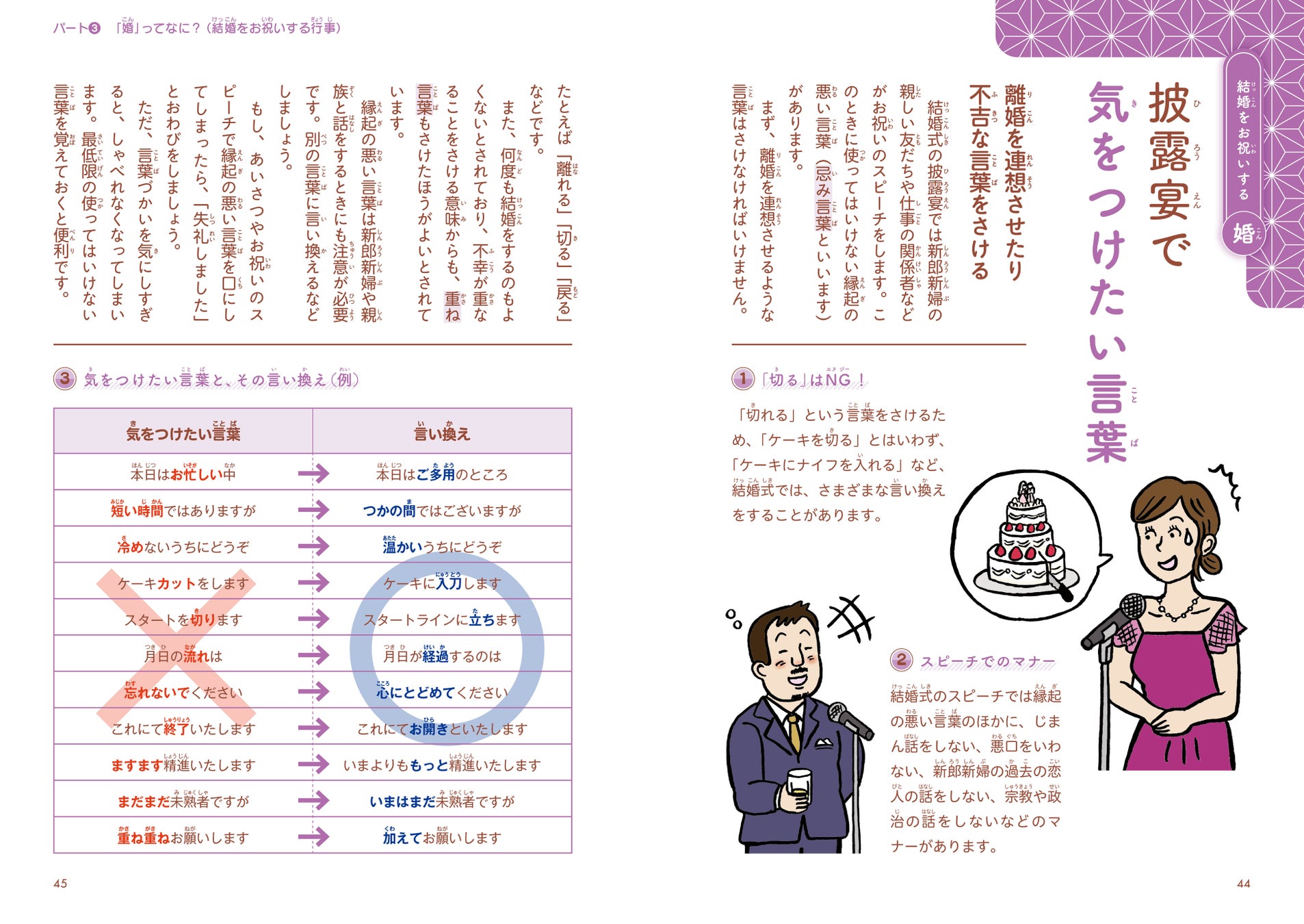 || パート3:婚(こん)ってなに?~結婚をお祝いする行事~・・・子どもが参列する機会のある結婚式。結婚や式にまつわる基礎知識、披露宴で気をつけたい言葉など、失敗しないためのポイントを具体的に教えます。