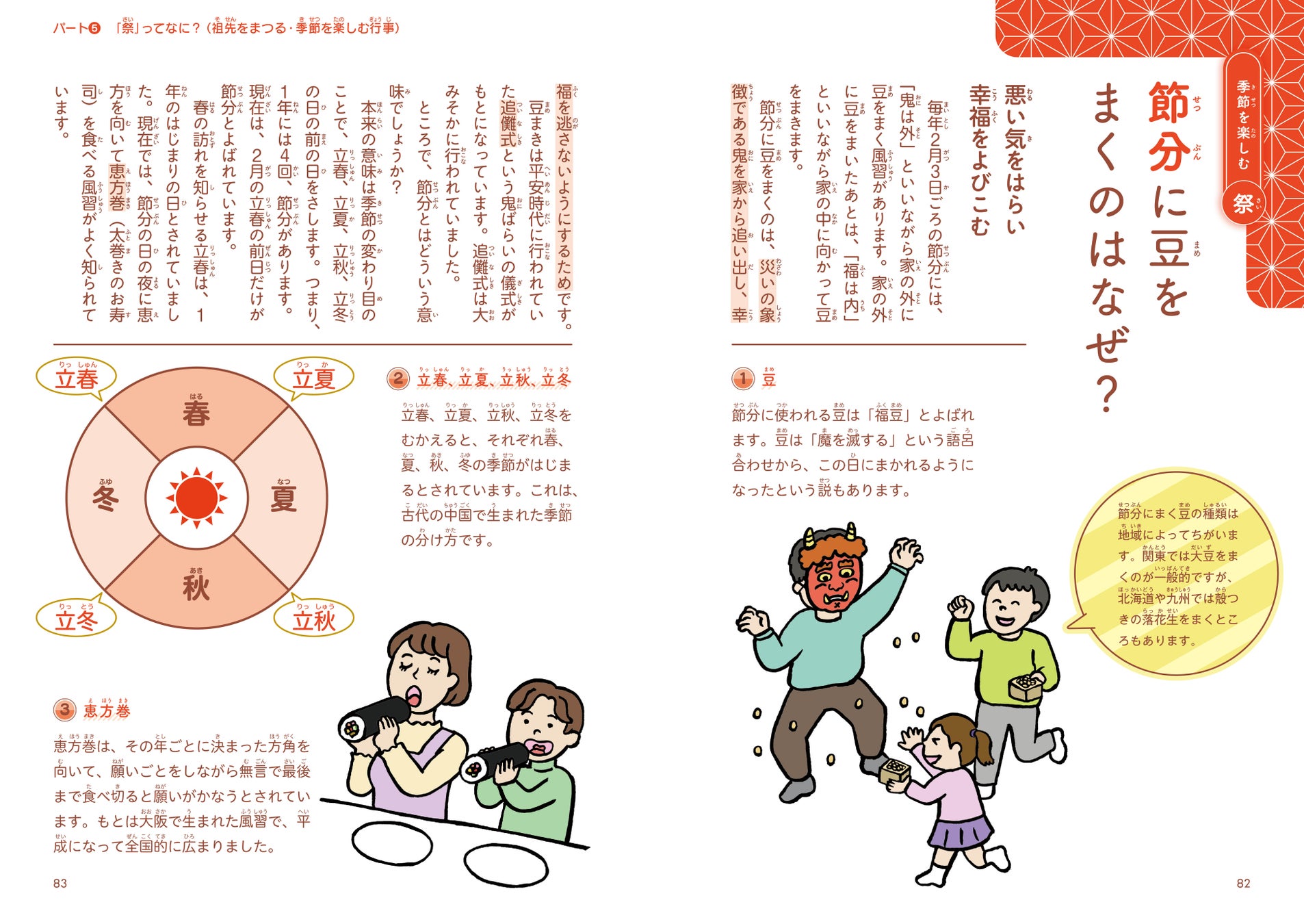 || パート5:祭(さい)ってなに?~祖先をまつる・季節を楽しむ行事~・・・お正月、節分、ひなまつり、端午の節句、お盆、お月見、大みそかなど、日本ならではの四季折々の行事を紹介。行事食や飾りの意味も楽しく学べます。